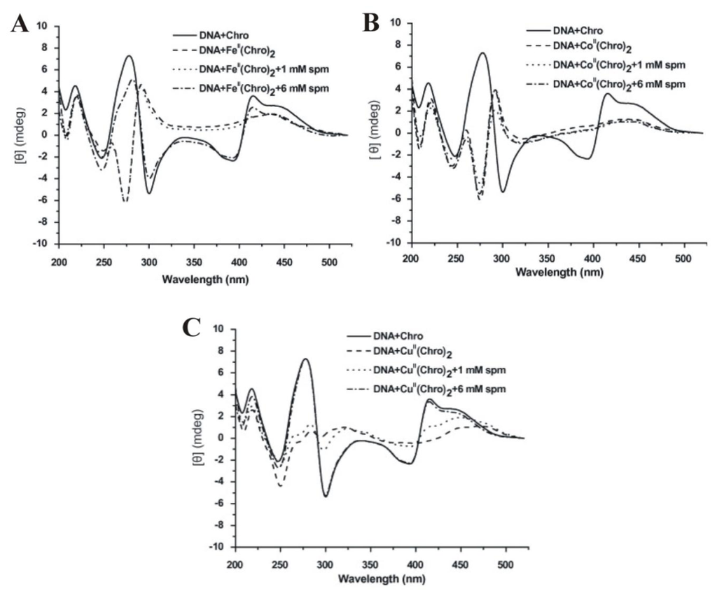 To monitor the effect of spermine on the structural integrity of the Fe2+-, Co2+-, and Cu2+-containing dimeric Chro complexes upon DNA binding, the DNA-Chro complexes interaction was examined with increasing concentration of spermine (0, 1, and 6 mM) [29]. As shown in Figure 9, the CD spectra of [(Chro)2-Co2+] and [(Chro)2-Fe2+] bound to the DNA duplex exhibited similar spectral features, with negative and positive peaks at 275 and 287 nm, respectively, which are good evidence for an octahedral coordination. However, adding 6 mM spermine to the DNA-[(Chro)2-Fe2+] complex reverted the CD spectrum to its original profile, suggesting spermine with this concentration is able to inhibit the formation of DNA-[(Chro)2-Fe2+] complex (Figure 9A). Surprisingly, the same concentration of spermine is unable to interfere with the interaction between DNA and the [(Chro)2-Co2+] complex (Figure 9B). In the reaction between DNA and [(Chro)2-Co2+], conformation of DNA changed upon binding with [(Chro)2-Co2+] and the CD spectra flattened at 275 and 287 nm upon this interaction (Figure 9C). Low concentration of spermine (1 mM) cause a slight decrease at 275 nm in the CD spectrum of the [(Chro)2-Cu2+]-DNA complex, implying that an interaction occurs between them. When the concentration of spermine increased to 6 mM, the DNA-[(Chro)2-Cu2+] adduct was completely abolished, as demonstrated by an almost completely inverted CD spectrum (Figure 10C). These data provide strong evidence that spermine exhibits a strong affinity to Fe2+ and Cu2+ chelated by Chro, while it cannot disrupt the [(Chro)2-Co2+] complex even at a high concentration.