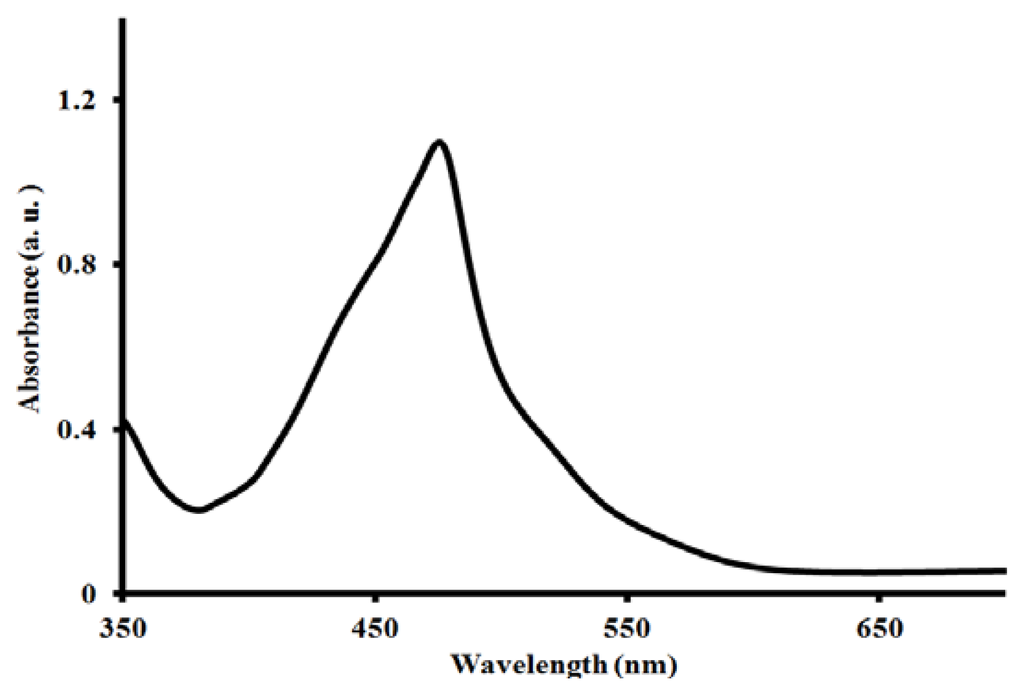 Shown in Figure 4, the UV-Vis absorption spectrum of [Ru(L1)2(PF6)2] complex in acetonitrile. The complex displays intense band in the ultraviolet region between 200–300 nm (not shown), this was assigned to the intra ligand π→π* charge-transfer transition of the terpyridine ligand. The complex exhibits a very broad and intense metal-to-ligand charge (MLCT) absorption band throughout the visible region of the spectrum (400–600 nm), characteristic of many other ruthenium(II) polypyridyl complexes, and which can be assigned to electronic transitions from the RuII based t2g orbital to the ligand based π* orbitals. The molar extinction coefficient of complex [Ru(L1)2(PF6)2] at its maximum (479 nm) is 10 400 M−1·cm−1. The lower-energy absorption in the complex was enhanced due to the presence of the electron withdrawing nature of the carboxylic groups, which lowers the energy of the π* orbital of the terpyridine ligand, an electron-donating group provided by the trans nature of the methyl groups destabilizes the reduction process and thus, expected to further improve the stability of the complex. The metal complex so obtained exhibits appreciable photophysical properties, most especially its molar extinction coefficient in the visible region which is significantly better compared to some that have already been reported for [Ru(tpy)2]2+ [33–36]. However, the complex exhibits a lower wavelength characteristic compared to the N3 and N719 standard dyes [14,31].