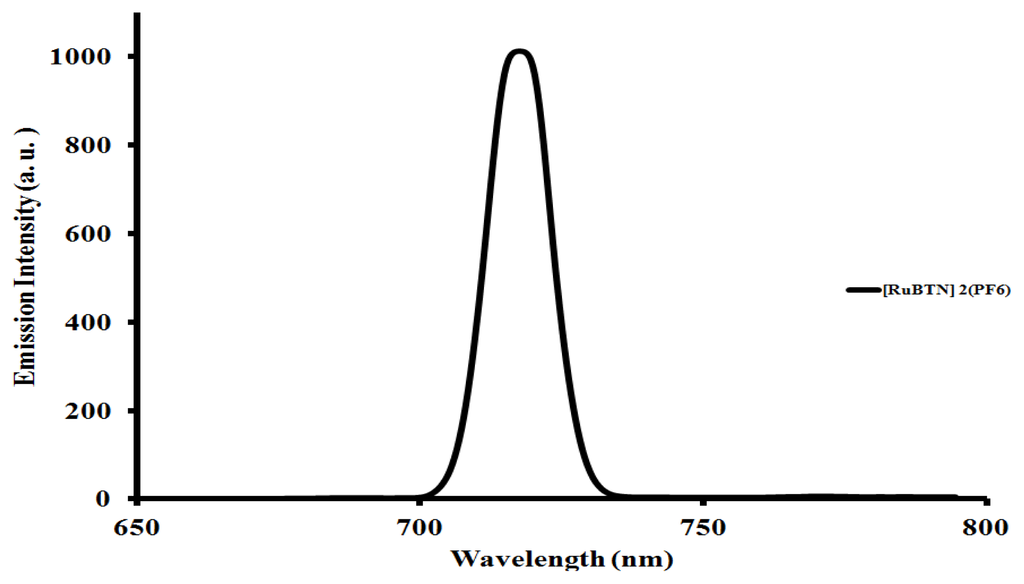 The emission spectrum of complex [Ru(L1)2(PF6)2] is displayed in Figure 5. Upon excitation into the 1LC and 1MLCT bands, (λexc. = 470 nm), the complex displays appreciable luminescence at room temperature. An emission wavelength maximum was found at 715 nm. It is well known that conjugated functional organic molecules are useful for the study of electron transport at the molecular scale and that the use of fused-ring systems is a powerful and practical approach. The luminescent properties of a complex as well as its ability to play the role of excited state reactant or product are related to the energy ordering of its low energy excited state and, particularly, to the orbital nature of its lowest excited state. It has been shown that the stronger the electron withdrawing group at the 4′-position of the terpyridine, the stronger the luminescence [8,9,15]. Thus, the choice of ligands has significant effect, which in turn influences the energy positions of the metal centre (MC) and ligand centre (LC), as well as the metal-to-ligand transfer (MLCT) of ruthenium(II) polypyridine complexes [20]. The energy of the MC excited state depends on the ligand field strength, which in turn depends on the σ-donor and π-acceptor properties of the ligands, the steric crowding around the metal (that can preclude a sufficiently close approach between metal and ligand), and the bite angle of the polydentate ligands (which in some cases cannot be optimized because of molecular constraint). The energy of the LC excited state depends on the intrinsic properties of the ligands, such as the HOMO-LUMO energy gap and the singlet-triplet splitting. It has been shown that the energy of the MLCT excited state depends on the reduction potential of the ligand involved in the MLCT transition, the oxidation potential of the metal in the complex (which is affected by the electron donor and acceptor properties of the ligands), and by the charge separation caused by the transition [37–44]. In the complex [Ru(L1)2(PF6)2], the intense emission is a significant contribution to the excited state from an interaction between the metal d-orbital and the ligand π-systems [28].