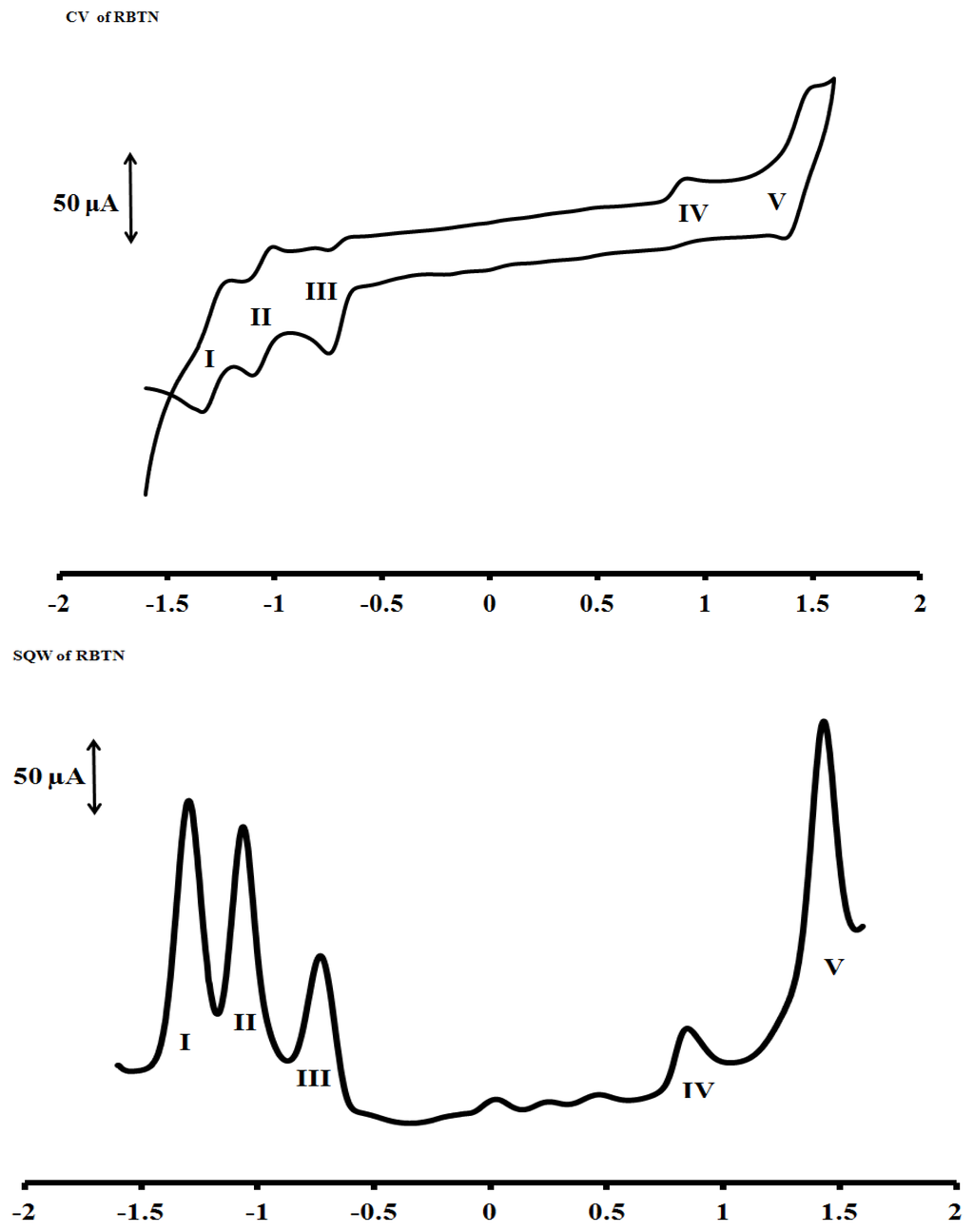 The cyclic and square wave voltammograms of the complex [Ru(L1)2(PF6)2] were examined in the potential range +1.5 to −1.5 V and at a scan rate 50 mV·s−1 using Ag|AgCl electrode in DMF solvent with 0.1 M tetrabutylammonium hexafluorophosphate as supporting electrolyte (Figure 6). The voltammograms display the Ru(III)/Ru(II) couple at positive potential and ligand based reduction couples at negative potentials. A reversible one-electron oxidation process V at E1/2 = +1.42 V was assigned to the metal centre Ru(III)/Ru(II) wave couple [17]. One unidentified irreversible oxidation peak process IV was observed at +0.82 V, which was tentatively ascribed to the ring oxidation of the terpyridine ligand and, as well as the carboxylate ions present in the complex. At the negative potential, three reversible waves were observed at −1.31, −1.07, and −0.75 V for processes I, II and III respectively. The more positive reduction potential may be assigned to the contribution from the ligand due to an additional (C=C) conjugative π-bond as found in the structure of terpyridine since the ligand contains the electron withdrawing COOH group of the anchoring ligand being responsible for lowering the LUMO levels [26].
