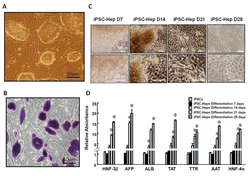Differentiation of 3-genes iPSCs (induced pluripotent stem cells) into 3-genes iPSC-Heps. (A) 3-genes iPSCs are capable of forming colonies similar in appearance to mouse embryonic stem cells (ESCs) and 4-genes iPSCs; (B) Colonies of 3-genes iPSCs stained positive for alkaline phosphate; (C) Morphological changes of 3-genes iPSC-Heps during hepatocyte differentiation; (D) Recruitment of hepatocyte-specific genes, including HNF-3β, AFP, ALB, TTR, AAT, TAT, and HNF-4α during the course of hepatocyte differentiation. In panels A, B and D, scale bar = 50 μm. In panel D, data shown here are the mean ± SD of three independent experiments. * P < 0.05 vs. undifferentiated iPSCs at Day 0.