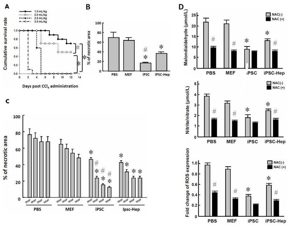 Effect of intraperitoneal cell transplantation (PBS, mouse embryonic fibroblasts (MEFs), iPSCs, or iPSC-Heps) on the hepatic pathology in CCl4-treated mice. (A) Determination of the optimal dose for the induction of acute hepatic failure (AHF) by intraperitoneal administration of CCl4 into BALB/c nude mice. 2.5 mL/kg body CCl4 was used as the standard treatment; (B) Quantification of H&E-stain of CCl4-treated liver tissue from recipients; (C) Quantification of H&E-stained liver sections from CCl4-treated mice that received PBS injection, transplantation of MEFs, 3-genes iPSCs, or 3-genes iPSC-Heps at 2 × 105, 5 × 105, 2 × 106, and 5 × 106 cells /kg body wt; (D) Changes in ROS levels (left), MDA content (middle), and nitrite/nitrate content (right) in the CCl4-injured livers of recipients in all groups with and without N-acetyl-cysteine (NAC) pretreatment. Data shown here are the mean ± SD of six independent experiments. In panel A, * P < 0.05 vs. 2.5 mL/kg body wt, # P < 0.05 vs. 2.0 mL/kg body wt. In panel B, * P < 0.05 vs. PBS or MEFs. # P < 0.05 vs. iPSC-Heps. In panel C, * P < 0.05 vs. PBS or MEFs at the same cell doses. # P < 0.05 vs. iPSC-Heps at the same cell doses. In panel D, * P < 0.05 vs. PBS or MEFs, # P < 0.05 vs. corresponding to recipient with NAC treatment.