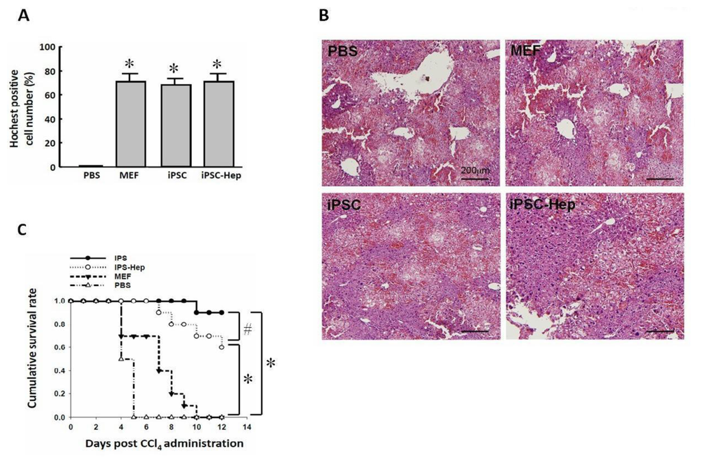 Effect of intraperitoneal cell transplantation (PBS, MEFs, 3-genes iPSCs, or 3-genes iPSC-Heps) on hepatic pathology, survival rate and biochemical parameters in CCl4-treated recipients. (A) Hoechst-stained cell engraftment in the CCl4-injured liver from recipients of PBS, MEFs, iPSCs, or iPSC-Heps; (B) Representative H & E stain of CCl4-treated liver tissue 24 h after receiving iPSCs, iPSC-Heps, MEFs or PBS treatment; (C) Intraperitoneal transplantation of 3-genes iPSCs or 3-genes iPSC-Heps rescued mice from lethal AHF. Data shown here are the mean ± SD of six independent experiments. In panel, * P < 0.05 vs. PBS. In panel C, * P < 0.05 vs. PBS or MEFs. # P < 0.05 vs. iPSC-Heps.