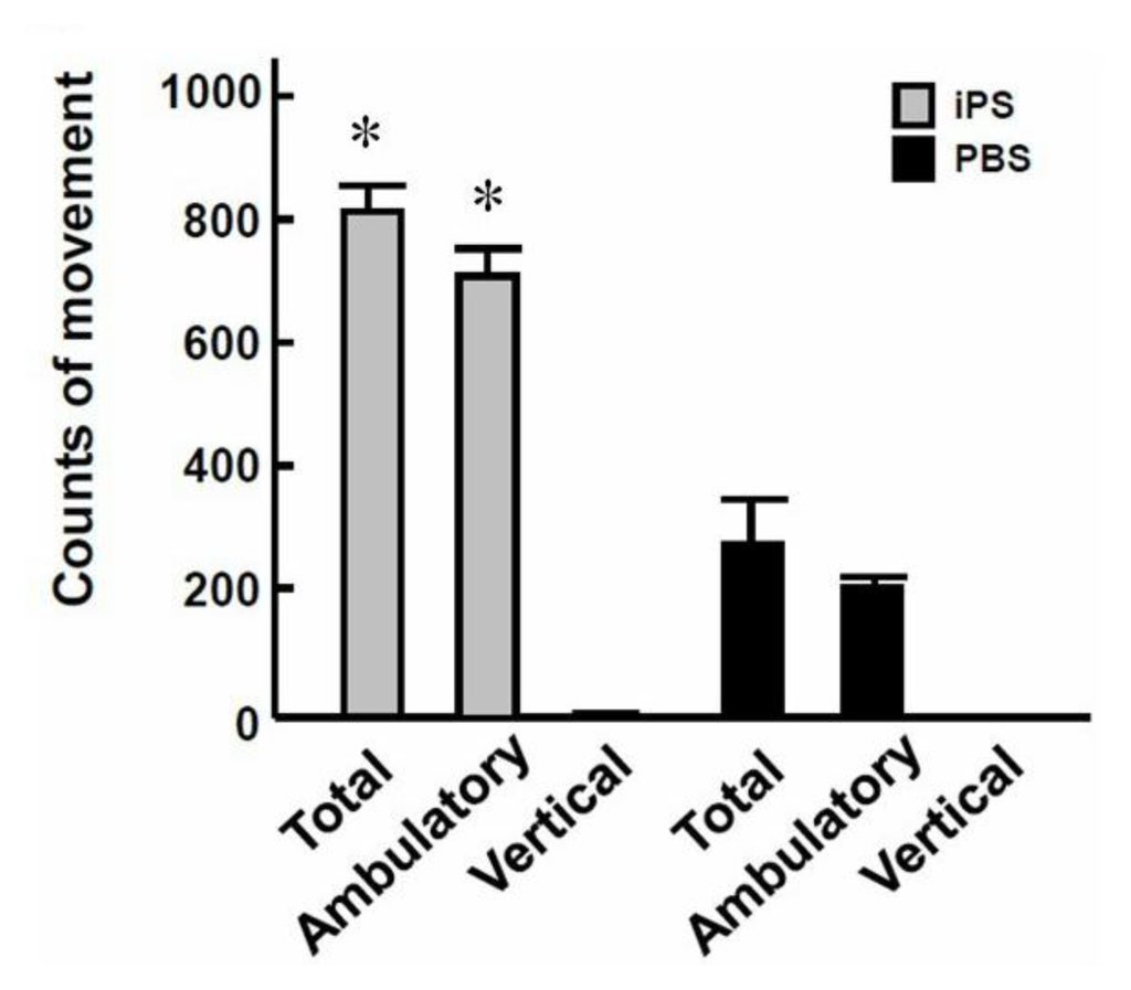 Furthermore, we examined whether 3-genes iPSC transplantation could improve hepatic encephalopathy by assessing the motor activity of CCl4-treated mice after cell transplantation. Motor activity assay indicated that, 72 h after CCl4 administration, the total movements and ambulatory movements were significantly increased in 3-genes iPSC recipients compared to mice which had received PBS injection only (Figure 6A, * P < 0.05 vs. PBS). These results demonstrated 3-genes iPSC treatment not only improved hepatic functions and animal survival, but also improved CCl4-induced hepatic encephalopathy. Furthermore, we performed an extended follow-up study for 4 months and found that recipients of 3-genes iPSCs and 3-genes iPSC-Heps survived, and no tumor formation was observed in either recipients. Severe tumor-like formation was found only in CCl4-treated recipients of 4-genes iPSCs (with the oncogene c-Myc), which were used as the positive control of tumorigenicity in this extended study (Table 2). This raised the possibility that obviation of c-Myc in iPSCs and iPSC-Hep may substantially reduce the incidence of tumorigenesis after transplantation.