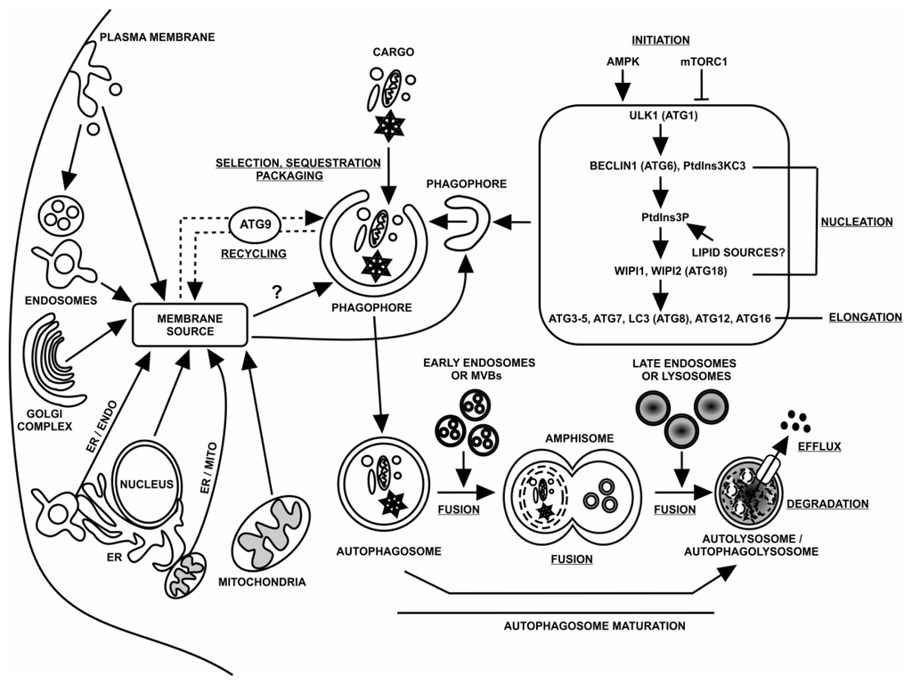 Schematic model of dynamic membrane events contributing to autophagosome life and death. The life and death of autophagosomes, which is evolutionarily conserved, involves the following stages (underlined): initiation, phagophore nucleation, phagophore elongation through two conjugation cascades, cargo selection, sequestration and packaging, membrane recycling regulated by Atg9, fusion with lysosomes, degradation and efflux. Key proteins that act at these stages during such processes are listed. Potential sources for the phagophore include the endoplasmic reticulum (ER), nuclear membranes, mitochondria, plasma membrane, Golgi complex and endosomes. The phagophore expands, sequestering and packaging the selected autophagy cargo, and finally closes, forming an immature autophagosome. During the maturation process, an amphisome is formed from the fusion of an autophagosome with early endosomes or multivesicular bodies, whereas an autolysosome/autophagolysosome is formed as a product of fusion of amphisomes events with late endosomes or lysosomes. Once in the lysosomes, the autophagic cargo is degraded into essential building blocks that are transported back into the cytoplasm. Abbreviations: AMPK, AMP-activated protein kinase; Atg, autophagy-related; BECLIN 1, BCL-2 interacting myosin/moesin-like coiled-coil protein 1; ER, endoplasmic reticulum; ER/ENDO, endoplasmic reticulum/endosomes contact; ER/MITO, endoplasmic reticulum/mitochondria contact; LC3, light chain 3; mTORC1, mammalian target of rapamycin complex 1; MVBs, multivesicular bodies; PM, plasma membrane; PtdIns3P, phosphatidylinositol 3-phosphate; PtdIns3KC3; phosphatidylinositol 3-kinase class III; ULK1, UNC51-like kinase 1; WIPI1/WIPI2, WD repeat domain phosphoinositide-interacting 1/2.