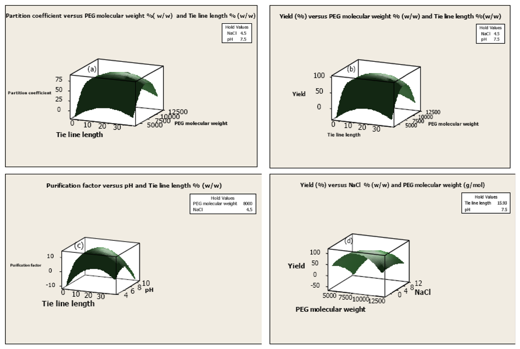 Response surface plots showing the interaction effects of (a) TLL and PEG molecular weight on partition coefficient; (b) TLL and PEG molecular weight on yield; (c) TLL and pH on purification factor; (d) PEG molecular mass and NaCl, on yield of serine protease.