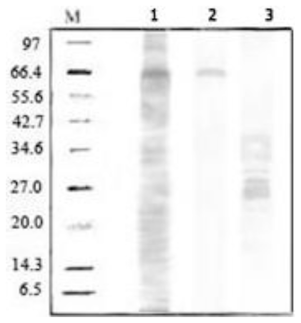 SDS-PAGE analyses on the serine protease, M = protein molecular markers (6.5–97 kDa); 1 = crude feedstock; 2 = ATPS top phase Lane; 3 = ATPS bottom phase.
