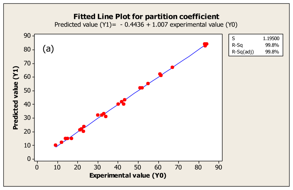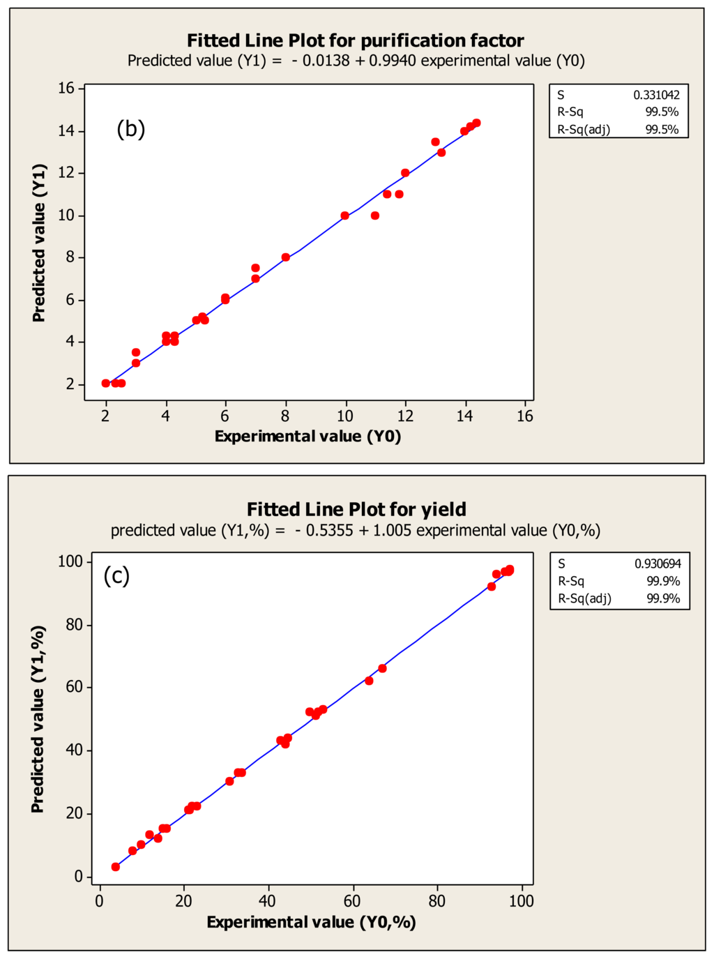 Table 2 shows the estimated regression coefficient, R2 and adjusted R2 as long as p-value of regression for each response variable (partition coefficient, purification factor and yield) is given. As shown in the table, the R2 values are obtained for all response variables higher than 0.8 (0.993–0.997) and p-value of regression is less than 0.05. Therefore, according to a criterion for validation of model presented by Joglekar and May [], the models are suitably and accurately employed for predicting the response variable as functional of independent variables. In addition, the comparison between experimental values and those predicted is shown in Figure 3a–c. It is seen there is overall closeness between experimental and predicted data, and based on Montgomery [] the closeness between these variables indicates the adequacy of the regression equations.