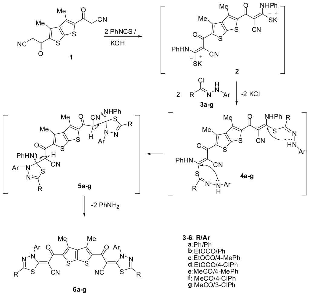The nucleophilic addition of thieno[2,3-b]thiophene 1 [19] to phenyl isothiocyanate in DMF, in the presence of potassium hydroxide, afforded the corresponding potassium salt 2. Heterocyclisation of the intermediate 2 with hydrazonoyl chlorides 3a [21] or 3b–d [22] or 3e–g [23] furnished in each case, one isolable product (as tested by TLC). The reaction products were identified as bis-[1,3,4]-thiadiazole structures 6a–g (Scheme 1).