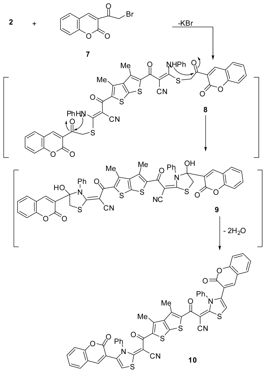 Next, the reactivity of the potassium salt 2 towards 3-(2-bromoacetyl)-2H-chromen-2-one (7) [25,26] was also investigated. Thus, treatment of potassium salt 2 with compound 7 gave one product that was identified as 3,3′-(3,4-dimethylthieno[2,3-b]thiophene-2,5-diyl)bis(3-oxo-2-(4-(2-oxo-2H-chromen-3-yl)-3-phenylthiazol-2(3H)-ylidene)propanenitrile) (10) as shown in Scheme 2. The reaction proceeds via nucleophilic displacement of bromide to give S-alkylated intermediate 8, followed by nucleophilic addition of (PhNH) group to carbonyl group of chromen-2-one ring to give the respective intermediate 9. Dehydration of the latter intermediate gave bis-thiazole derivative 10 as the final product. The IR spectrum of the isolated product showed absorption bands at 2195, 1647 and 1724 cm−1 due to nitrile function and carbonyl groups, respectively. Its 1H NMR spectrum showed singlet signal at δ 2.49 ppm due to methyl protons, in addition to aromatic multiplets in the region δ 7.02–8.6 ppm.
