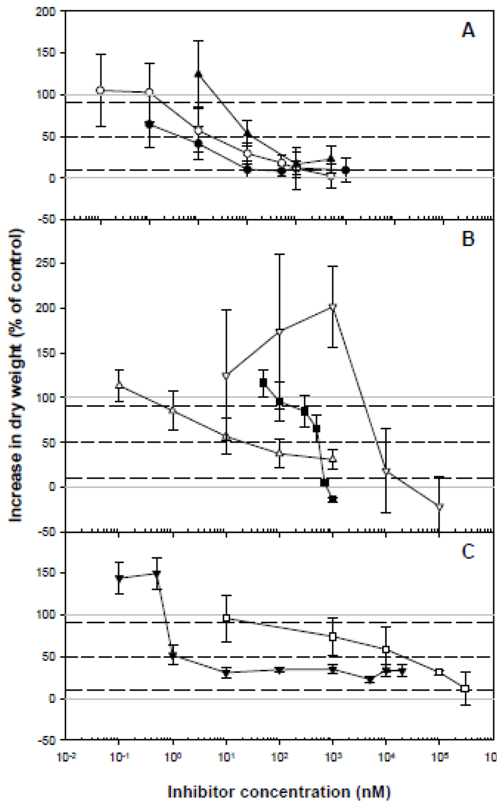 Dose-response curves for several putative CBIs on bean calluses growth. Calluses growth was calculated as the percentage increase in dry weight relative to the untreated calluses after 30 d culture. A: (●) CGA 325′615, (▴) triazofenamide, (□) compound 1; B: (▵) oxaziclomefone, (■) dichlobenil, (▿) quinclorac; C: (○) flupoxam, (▾) AE F150944. Values are means ± SD of 8 measurements. Dotted lines were included in order to estimate I10, I50 and I90 values. Solid grey lines indicate the 100% and 0% of growth.