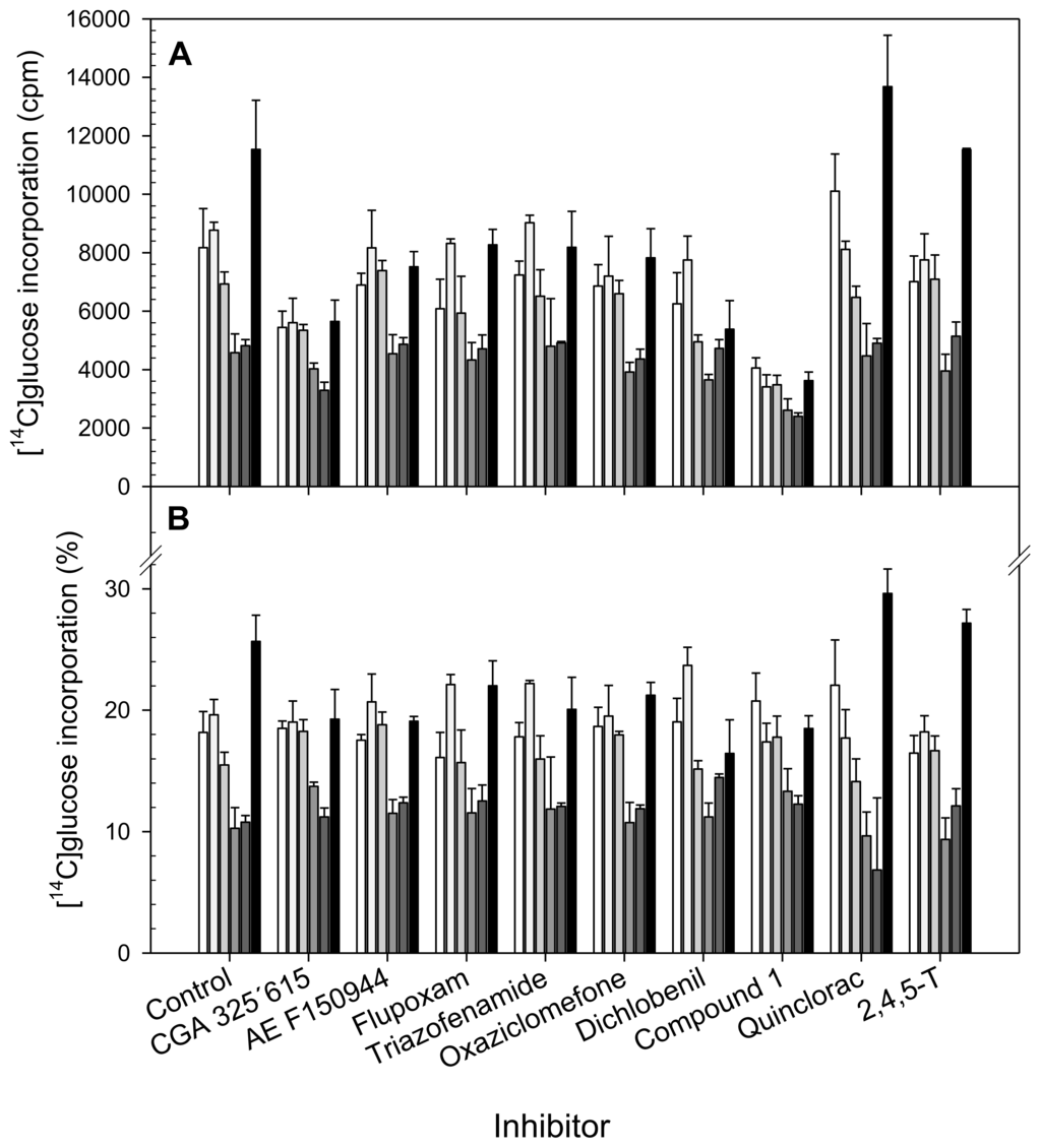 The pattern of [14C]glucose uptake into the different cell compartments was similar for all the inhibitors tested and for the control. [14C]glucose incorporation into the cell wall was low in comparison to its incorporation into the cytosol, which was the main sink for [14C]glucose (data not shown). With regard to [14C]glucose incorporation into the cell wall fractions of untreated cells (Figure 2A), the highest incorporation was observed for α-cellulose, whereas the lowest labeling was found for the Sn-CR and ANW fractions. [14C]glucose incorporation into pectins from both the CDTA and carbonate fractions was slightly higher than into hemicelluloses. This incorporation pattern was very consistent in all the incorporation experiments (Figure 2A). [14C]glucose incorporation into cell wall was reduced by all CBI-treatments except by quinclorac and 2,4,5-T. Direct comparison among treatments was difficult. So, in order to deepen understanding of the CBIs in the cell wall compared with the control and to identify trends on carbon flow towards the cell wall polysaccharides, percentages of incorporation into each fraction regarding to total incorporation into the cell wall were calculated (Figure 2B). Except for the cases of quinclorac and 2,4,5-T, treatments with the inhibitors reduced the [14C]glucose incorporation into α-cellulose (between 14 and 36%), and increased it for the tightly bound cellulose fractions (Figure 2B). This fact demonstrates that they effectively are able to affect cellulose biosynthesis, and illustrates that a difference among short and long term responses exists. By contrast, quinclorac increased [14C]glucose incorporation into α-cellulose and decreased it for the ANW fraction, and the synthetic auxin (2,4,5-T) showed similar effects. Treatment with compound 1 or quinclorac increased incorporation into the CDTA-extracted pectins and decreased it into polysaccharides extracted in carbonate fraction, whilst flupoxam had the opposite effect and dichlobenil only increased incorporation into the carbonate fraction. Finally, the incorporation of [14C]glucose into KOH-soluble hemicelluloses increased after exposure to CGA 325′615, AE F150944, compound 1 and oxaziclomefone.