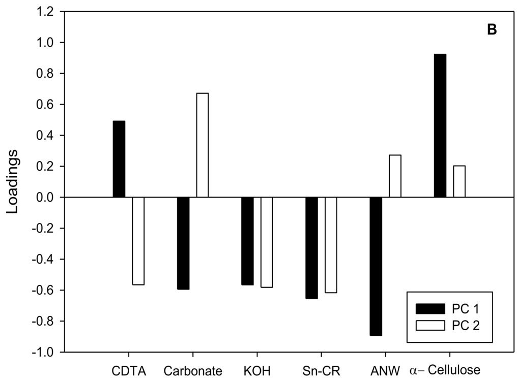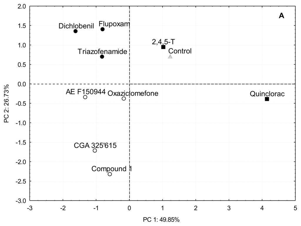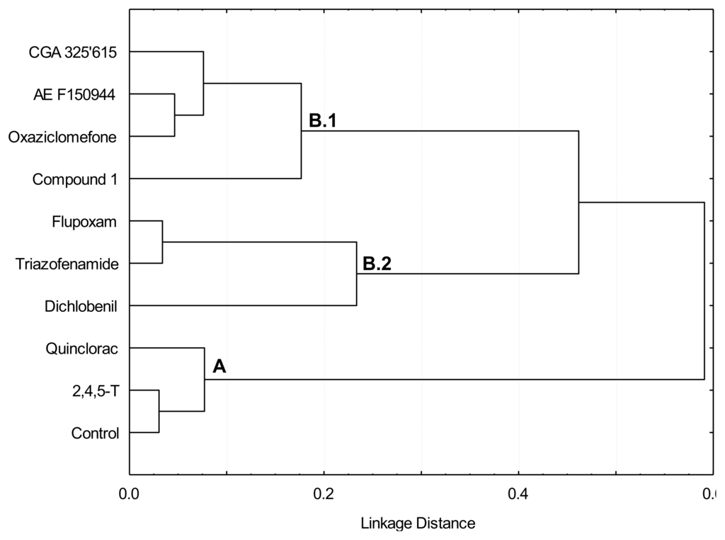 Results obtained from relative [14C]glucose incorporation into cell wall fractions were further analyzed by Principal Component Analysis (PCA) (Figure 3A,B), a multivariate analysis that orders variables regarding gradients along Principal Components (PCs). Almost 80% of total variance was explained by PC1 and PC2. According to factor loadings (Figure 3B), PC1 (approx. 50% of variance explained) had a strong positive correlation with α-cellulose and a negative correlation with ANW. Therefore, the analysis located the inhibitors in opposite sides of PC1, depending on their patterns of glucose incorporation into α-cellulose. Those compounds able to inhibit the incorporation of [14C]glucose into cellulose (flupoxam, dichlobenil, triazofenamide, compound 1, CGA 325′615, oxaziclomefone and AE F150944) were located on the negative side of PC1 (Figure 3A). On the other hand, those compounds that did not affect or increased incorporation into α-cellulose, such as quinclorac and 2,4,5-T, were located towards the positive side of PC1, grouping with untreated cells. Comparing this result with the dendrogram (Figure 2), there is a perfect match of A and B branches with the groups obtained by PCA. Thus, these two different multivariate analyses detect the same blocks of glucose incorporation patterns, corroborating the differences between these groups of inhibitors.