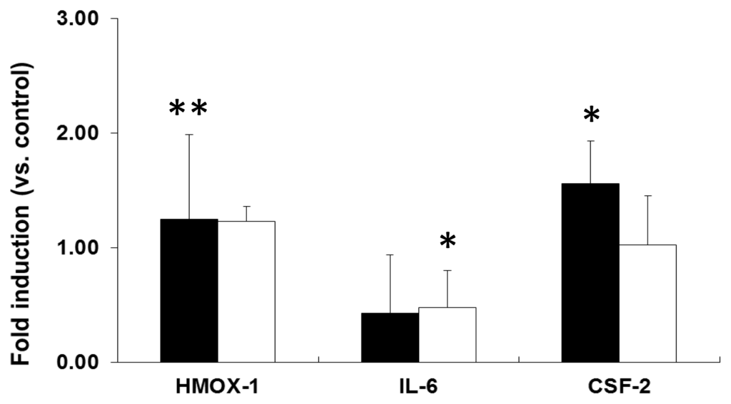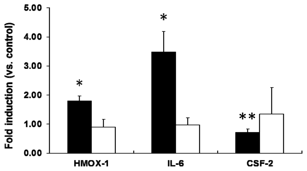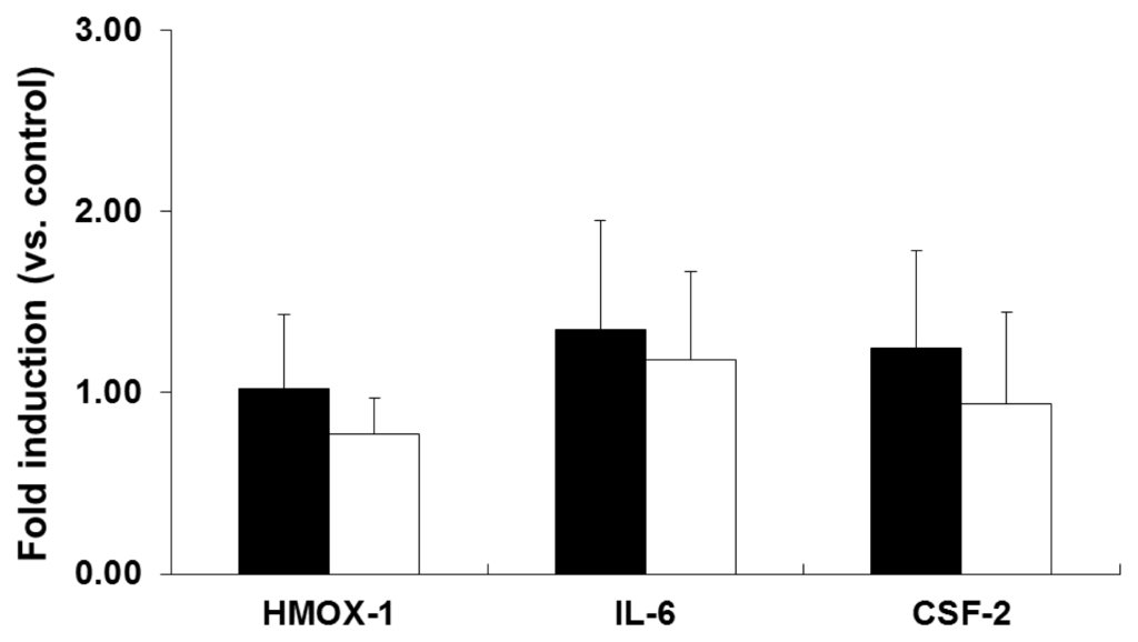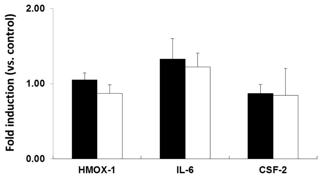 Similarly, neither 6 h nor 24 h of exposure to PEG-TiO2 NPs resulted in induction of HMOX-1, IL-6, or CSF-2 mRNA expression in HeLa cells (Figure 7). In HepG2 cells, 6 h of PEG-TiO2 NP exposure resulted in significant induction of CSF-2 mRNA expression compared to control cells (Figure 8, solid black bars), and a reduction in IL-6 mRNA expression after 24 h of exposure (Figure 8, open bars). The data indicate that each cell line responds differently to PEG-TiO2 NP exposure, which suggests that the induction of mRNA expression depends upon both the NPs and the cell type.