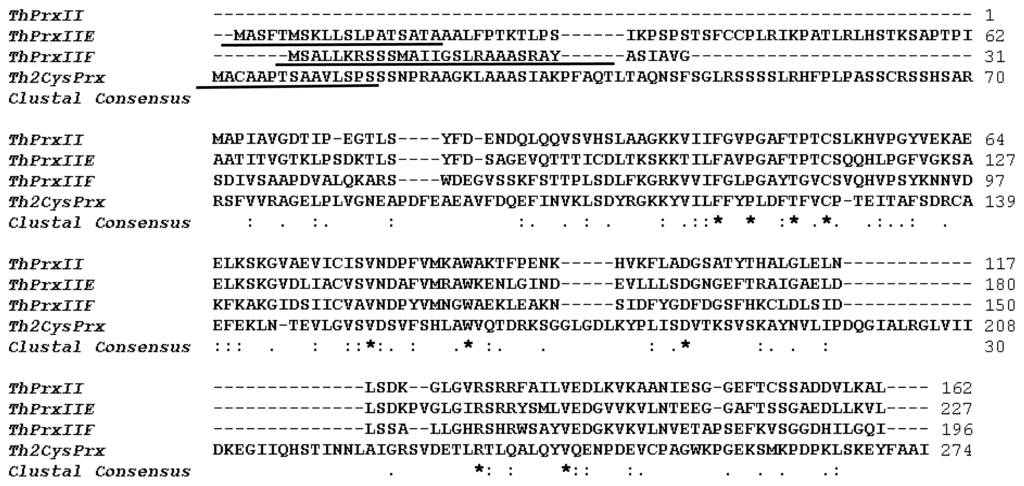 Multiple sequence alignments of the four ThPrx proteins from T. hispida. Signal prediction analysis showed the three ThPrxs contain signal peptides with 17–26 amino acids. The signal peptide of each ThPrx is underlined.