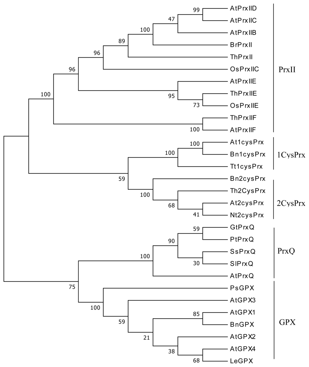 Phylogenetic tree of proteins homologous to Prx. Members of the four Prx proteins, including 2Cys-Prx, 1Cys-Prx, Prx-Q, and Type-II Prx, and in addition the Gpx family members were clustered with ClustalX. The first two letters correspond to the initials of the organism genus and species names. GenBank accession numbers are indicated: 1Cys-Prx: Arabidopsis, At1cysPrx (NP_175247); Brassica napus, Bn1cysPrx (AAF61460); Triticum turgidum, Tt1cysPrx (AAG50024). 2Cys-Prx: Arabidopsis, At2cysPrxA (NP_187769); Brassica napus, Bn2cysPrx (AAG30570); Nicotiana tabacum, Nt2cysPrx (CAC84143). Prx-Q: Arabidopsis, AtPrxQ (NP_189235); Gentiana triflora, GtPrxQ (BAD04985); Populus trichocarpa x Populus deltoides, PtPrxQ (AAS46230); Suaeda salsa, SsPrxQ (AAQ67661); Sedum lineare, SlPrxQ (BAA90524). Type-II Prx: Arabidopsis, AtPrxIIB (NP_176773); AtPrxIIC (NP_176772); AtPrxIID (NP_564763); AtPrxIIE (NP_190864); AtPrxIIF (NP_566268); Oryza sativa, OsPrxIIC (AAG40130); OsPrxIIE (BAA82377); Brassica rapa, BrPrxII (AF133302). GPX: Arabidopsis, AtGPX1 (NP_180080); AtGPX2 (NP_180715); AtGPX3 (NP_181863); AtGPX4 (NP_566128); Pisum sativum, PsGPX (sp|O24296); Lycopersicon esculentum, LeGPX (sp|O24031); Brassica napus, BnGPX (AAM12502).