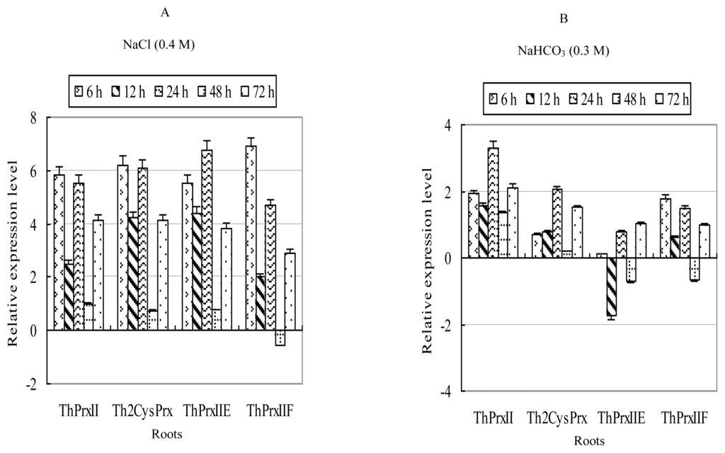 In roots, all four ThPrx genes with the exception of ThPrxIIF were highly induced by NaCl stress at all treatment times, with the highest transcription levels being induced more than 56.8-fold (Figure 3A). The transcription levels of ThPrxII, ThPrxIIE and ThPrxIIF reached their peak levels at an early time point (6 h). Th2CysPrx reached its highest transcription level at 24 h, with the second highest levels at 6 h. In stems, except for ThPrxII being down-regulated at 6 h, the other three ThPrxs genes were all induced throughout the treatment period. However, the induction rate in stems was lower than that in roots. The most highly induced gene was ThPrxIIE, which was induced 4.96-fold at 72 h of stress. In leaves, the expression patterns of the four ThPrxs genes were different. For instance, ThPrxII was down-regulated by NaCl stress. The transcription of ThPrxIIF was not altered at the early treatment stage and down-regulated at a later stage. Th2CysPrx was down-regulated at 6 and 24 h but was up-regulated at 12, 48 and 72 h. ThPrxIIE was up-regulated at all time points.