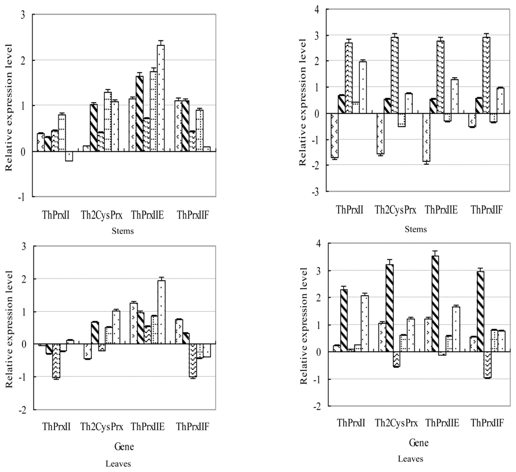 In roots, the transcription levels of ThPrxII, ThPrxIIE and ThPrxIIF were generally decreased, while Th2CysPrx at most time points was up-regulated. In stems, ThPrxII was down-regulated, while the other three ThPrxs were all up-regulated. In leaves, all four ThPrx gene transcriptions were down-regulated (Figure 4A).