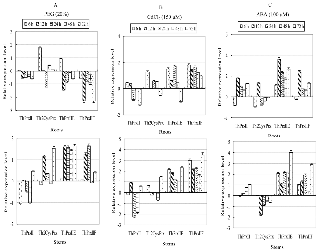 The RT-PCR results demonstrated that the four ThPrx genes shared similar expression patterns in roots, stems and leaves under the regulation of ABA. ThPrxII, ThPrxIIE and ThPrxIIF were up-regulated at most time points. In contrast, Th2CysPrx transcription was down-regulated, especially in stems and leaves (Figure 4C).
