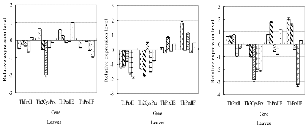 Relative expression levels of the four ThPrx genes in T. hispida roots, stems and leaves under normal growing condition were studied by using real-time PCR. The transcription level of the gene Actin was assigned as 100, and the transcription levels of ThPrx genes were plotted relative to the Actin gene transcription level (Table 3). The results indicated that these ThPrx were expressed in all tissues including roots, stems and leaves. Among these ThPrxs, the transcription levels of ThPrxIIE were the lowest in roots, stems and leaves, while the transcription levels of ThPrxII were the highest in all tissues. Transcription levels of Th2CysPrx were the second highest except in roots, where the relative abundance of Th2CysPrx and ThPrxIIF were nearly similar.