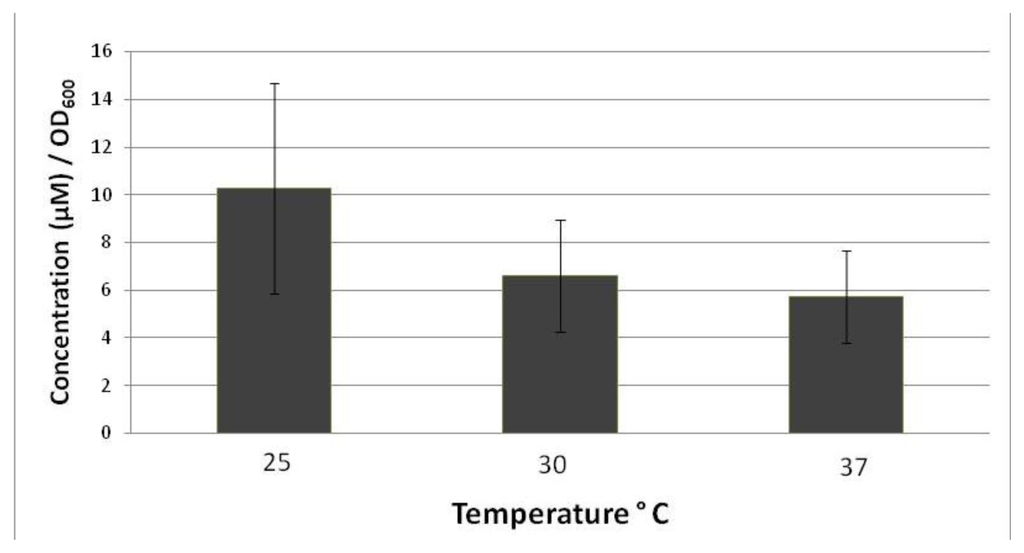 Catechol production is regulated by B. thuringiensis growth temperature. Cultures were grown to stationary phase and the optical density of each culture was measured. The Arnow assays were performed on sterile aliquots and the amount of catechol present quantified from a standard curve. Catechol was then normalized by growth (OD600). Results indicate the average of four experiments and arrow bars indicate the mean standard deviation. The catechol concentration was 10.25 (±4.42), 6.59 (±2.95) and 5.7 (±1.93) μM/OD600 for 25, 30 and 37 °C, respectively.