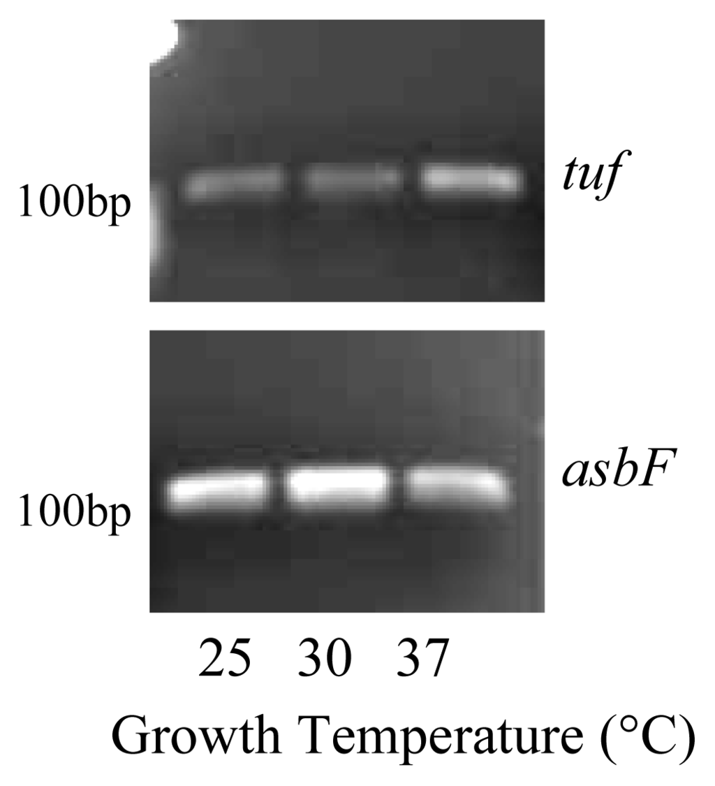 AsbF was expressed in B. thuringiensis cells grown in iron restricted medium at 25 °C, 30 °C and 37 °C. RNA was isolated from stationary phase cells and reverse transcription PCR with 25 cycles was used to detect gene expression. Experiments were performed in triplicate and a representative gel is shown the internal control tuf.
