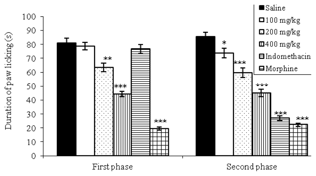 | Acetylsalicylic acid | 200 | 20.62 ± 1.69 *** | 68.93 |