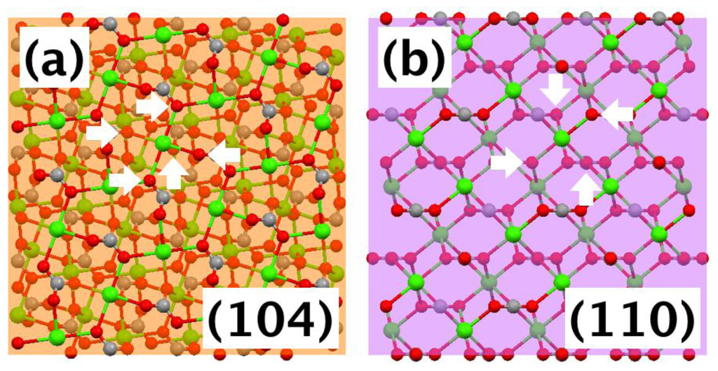 - Aquilano, D.; Calleri, M.; Natoli, E.; Rubbo, M.; Sgualdino, G. The {104} cleavage rhombohedron of calcite: theoretical equilibrium properties. Mater. Chem. Phys 2000, 66, 159–163. [Google Scholar]