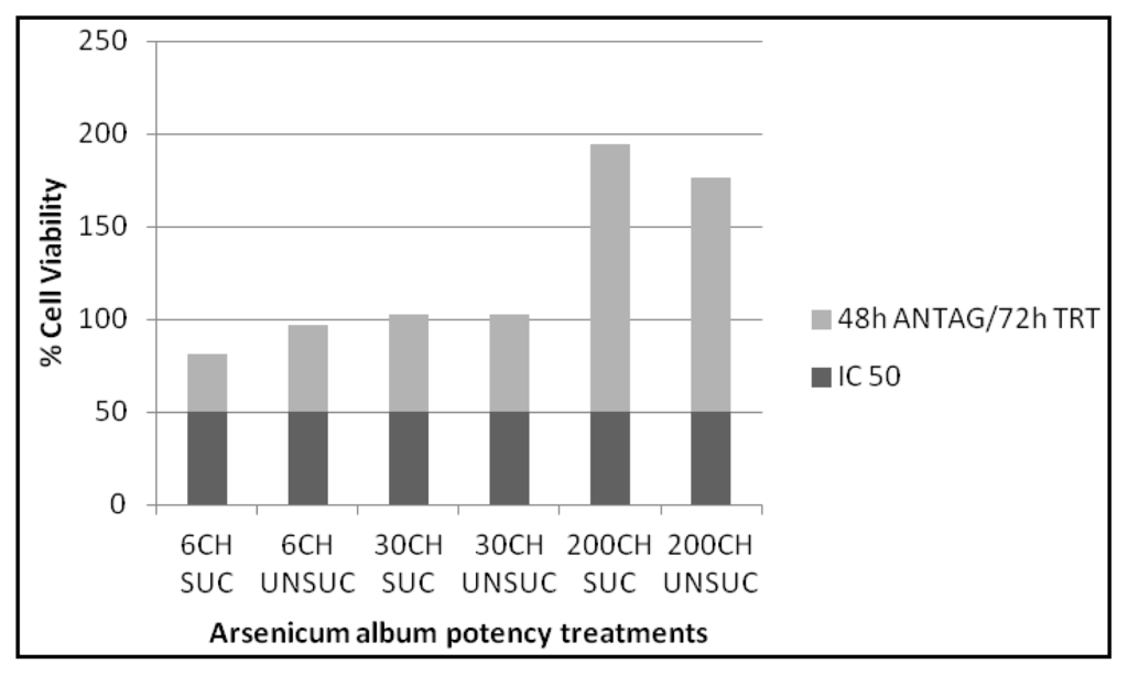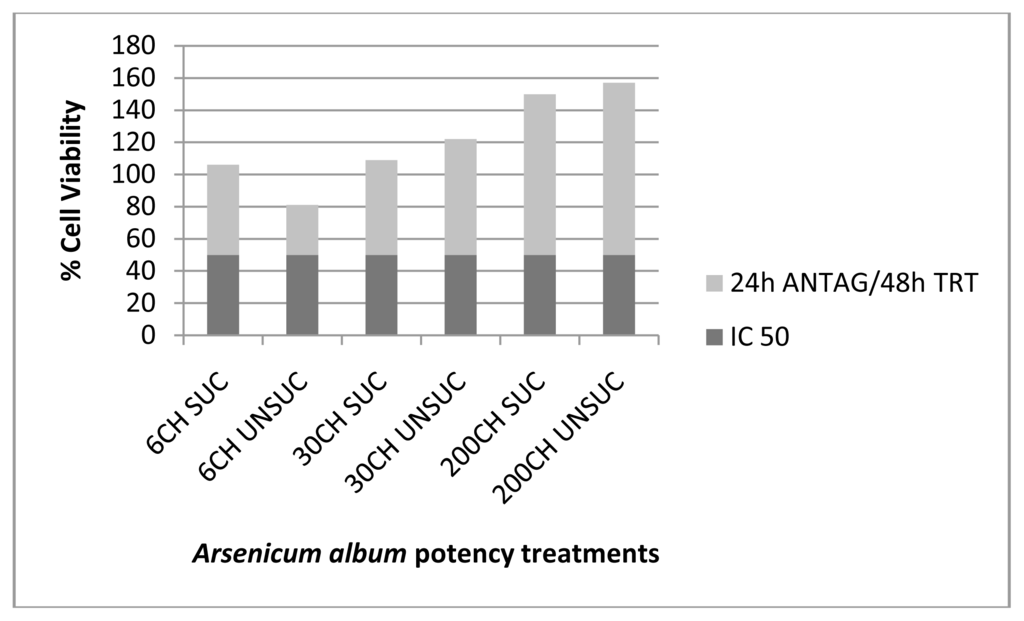 Homeopathy is defined as a medical art that brings about cure through the administration of a medicine which is minute in dose and given according to similarity, by lifting the disease without pain or debilitation [1]. In order to evaluate the general principles of homoeopathy, an in-vitro study using human cells was designed, to determine whether the Law of Similars, hormesis, potentization and succussion could be reproduced on a cellular level. One of the fundamental principles in homoeopathy is the law of similars, also known as “Similia similibus curentur”, meaning “let like cure like” [1]. This study tested self-recovery of cells by applying a homoeopathic dose of the same substance that was responsible for the disease state; in this case Arsenicum album was given after the cells had been exposed to the IC50 As2O3 [2]. This was done according to the law of similars, where the potentization process caused the remedy to change slightly, and so was only similar and not identical to the original substance [1]. The phenomenon of hormesis is defined as a biphasic dose-response where stimulatory processes are induced with low doses [3]. Homoeopathic remedies are low concentrations that therefore stimulate, and lower potencies stimulate less than higher potencies [4]. This study tested and compared three different potencies of vastly different concentrations, in order to identify whether self-recovery of the cells would occur and which potency would stimulate self-recovery of the cells the most. Due to the concerns regarding whether potencies would have an effect when Avogadro’s constant was exceeded [5], this study aimed to further explore the concept of potentization and succussion beyond Avogadro’s constant by using 30CH (1 × 10−60) and 200CH (1 × 10−400) potencies, as well as 6CH (1 × 10−12) potencies where the original substance was still present. It is vital to identify an accepted scientific model of homoeopathic research that is reproducible, in order to strengthen the evidence of future experiments [6].