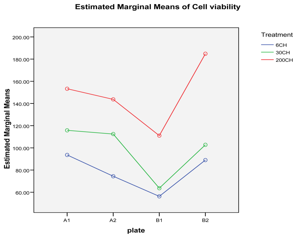 SPSS version 15.0 was used to analyze the data. A p value of < 0.05 was considered as statistically significant. The effects of plate, succussion and treatment were examined with percentage cell viability as the dependent variable. It was found that the main effects of plate and treatment were statistically significant determinants of cell viability in the model (p < 0.001). There were no significant interaction effects, and succussion was also seen as not being significant (p > 0.05).