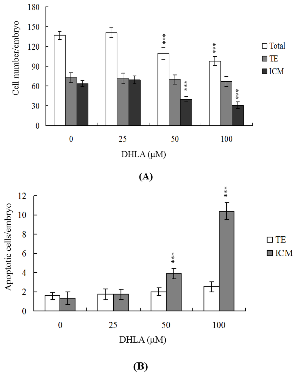 Effects of DHLA on blastocyst viability. Mouse blastocysts were treated with or without DHLA (25, 50 or 100 μM) for 24 h. (A) The total number of cells per blastocyst and cell numbers in the inner cell mass (ICM) and trophectoderm (TE) were counted; (B) The percentages of Annexin V-positive/PI-negative cells in blastocysts of each group were examined. Data are based on at least 200 blastocyst samples from each group. *** P < 0.001 versus the control group.