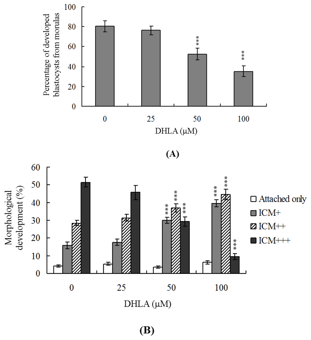 In vitro development of mouse embryos exposed to DHLA at the blastocyst stage. (A) Mouse morulae were treated with DHLA (25, 50 or 100 μM) for 24 h or left untreated, and cultured for an additional 24 h at 37 °C. Blastocysts were counted and percentages calculated; (B) Mouse blastocysts were treated with DHLA (25, 50 or 100 μM) for 24 h or left untreated and cultured for 7 days post-treatment. Blastocysts were identified as attachment only, ICM(+), ICM(++), and ICM(+++) via morphological assessment, as described in Materials and Methods. Values are presented as means ± SEM of eight determinations. *** P < 0.001 versus the control group.