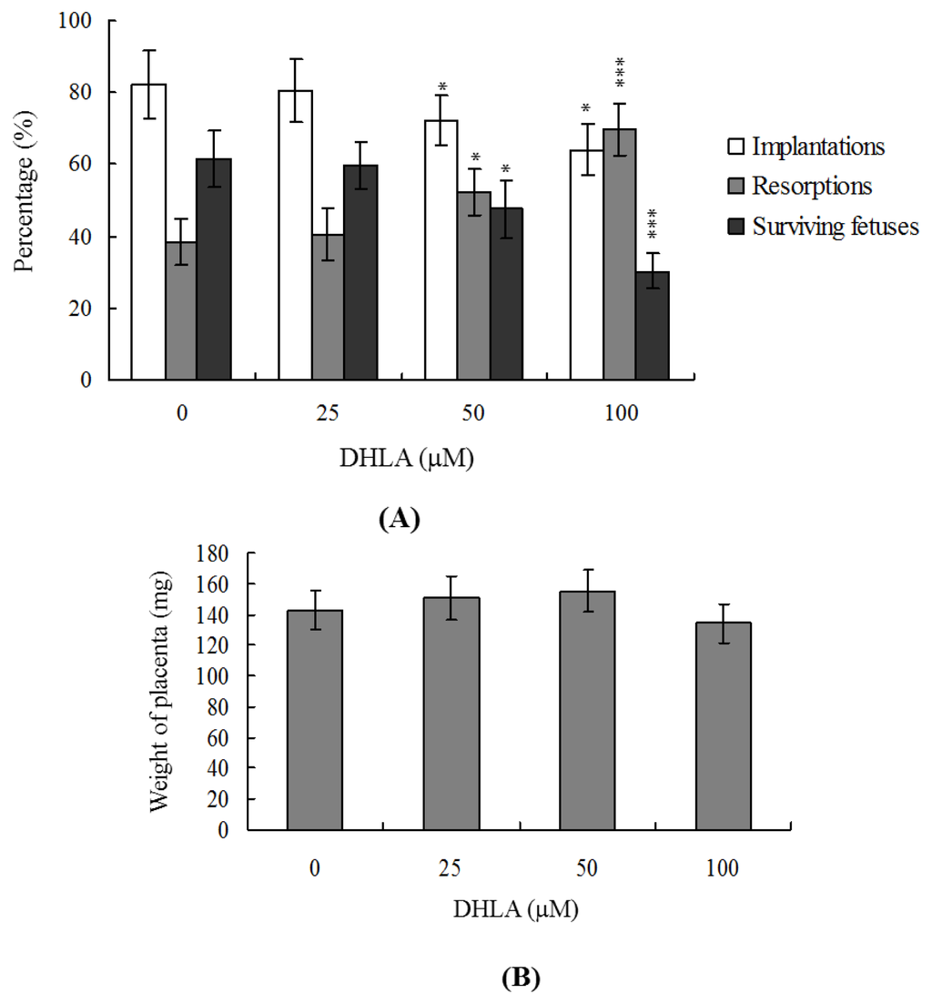 To examine the ability of expanded blastocysts to implant and develop in vivo, the generated embryos were transferred to recipient mice. ICR females (white skin color) were mated with vasectomized males (C57BL/6J; black skin color; from National Laboratory Animal Center, Taiwan, ROC) to produce pseudopregnant dams as recipients for embryo transfer. To ensure that all fetuses in the pseudopregnant mice came from embryo transfer (white color) and not from fertilization by C57BL/6J (black color), we examined the skin color of the fetuses at day 18 post-coitus. To assess the impact of DHLA on postimplantation growth in vivo, blastocysts were exposed to 0, 25, 50 and 100 μM DHLA for 24 h, and then 8 embryos were transferred in parallel to the paired uterine horns of day 4 pseudopregnant mice. The surrogate mice were killed on day 18 post-coitus, and the frequency of implantation was calculated as the number of implantation sites per number of embryos transferred. The incidence rates of resorbed and surviving fetuses were calculated as the number of resorptions or surviving fetuses, respectively, per number of implantations. The weights of the surviving fetuses and placentae were measured immediately after dissection.
