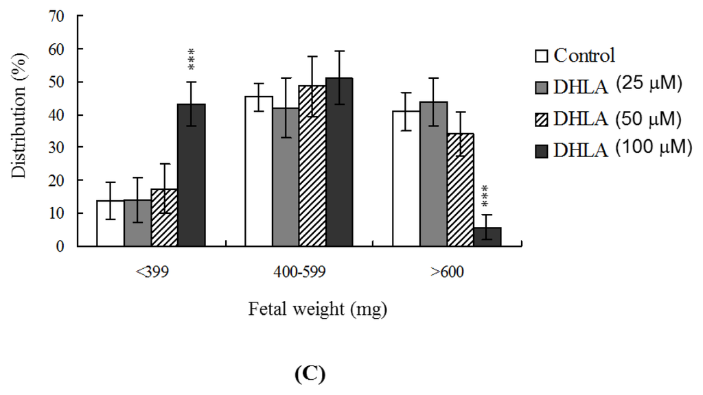 To determine the effects of DHLA on blastocyst development in vivo, we transferred control and DHLA-pretreated mouse blastocysts, and examined the uterine content at 13 days post-transfer (day 18 post-coitus). The implantation ratios in the 50–100 μM DHLA-pretreated groups were significantly lower than that of the untreated control group (Figure 4A). Embryos that implanted but failed to develop were subsequently resorbed. However, the proportion of implanted embryos that failed to develop normally was markedly higher in the group treated with 50–100 μM DHLA (Figure 4A). Interestingly, no significant differences in placental weight were observed between the DHLA-treated and untreated groups (Figure 4B). However, fetal weight was lower in the 100 μM DHLA-treated group compared to the control group (479 ± 61 mg versus 611 ± 68 mg, respectively). Previous studies, including a recent report by our group, showed that 35–40% of fetuses weigh more than 600 mg, and the average weight of total surviving fetuses is about 600 ± 12 mg in the untreated control group at day 18 of pregnancy in a mouse embryo transfer assay [23,27–30]. Fetal weight is an important indicator of developmental status, and the average fetal weight of the untreated control group is used as a key marker of development of blastocysts treated with 100 μM DHLA. Interestingly, only 5.8% of the fetuses in the 100 μM DHLA-pretreated group weighed more than 600 mg (indicative of successful embryonic and fetal development), whereas 43% of control fetuses exceeded this threshold (Figure 4C). These observations collectively indicate that exposure to high concentrations of DHLA (such as 100 μM) at the blastocyst stage reduces embryo implantation and the potential for post-implantation development.
