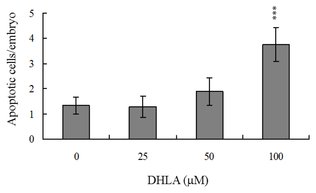 To investigate the possibility of DHLA-induced cytotoxicity, we treated mouse blastocysts with 25, 50 or 100 μM DHLA at 37 °C for 24 h, and monitored apoptosis using the TUNEL method. Cellular apoptosis was evident in blastocysts treated with 50 μM DHLA (Figure 1A). Quantitative analysis revealed ~2.5 to 7.5-fold more apoptotic cells in 50–100 μM DHLA-treated blastocysts, compared with untreated control cells (Figure 1B). Clearly, DHLA induces apoptosis in mouse blastocysts within the 50–100 μM concentration range.