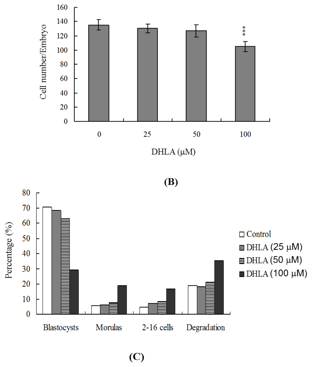 2.3. Effects of DHLA on Mouse Embryonic Developmental Potential in Vitro