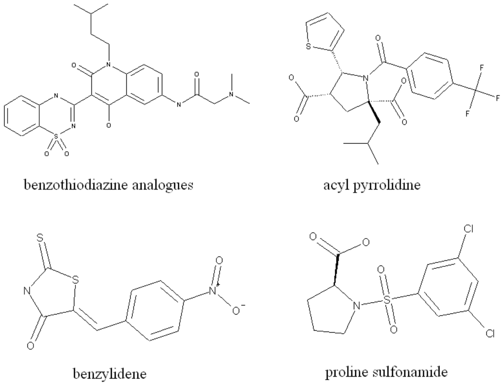 NNIs (non-nucleoside analogue inhibitors) provide an alternative mechanism to target viral polymerases. Greater variability is possible with HCV inhibitors as multiple allosteric binding sites are present on the HCV polymerase. Up to now, four binding sites of NS5B polymerase have been identified: NNI site I and site II are located in the thumb domain, while III and IV are closer to the active site in the palm domain [10]. In this work, we will work on NS5B NNI III binding site inhibitors. The representative molecules at this binding site are shown in Figure 1.
