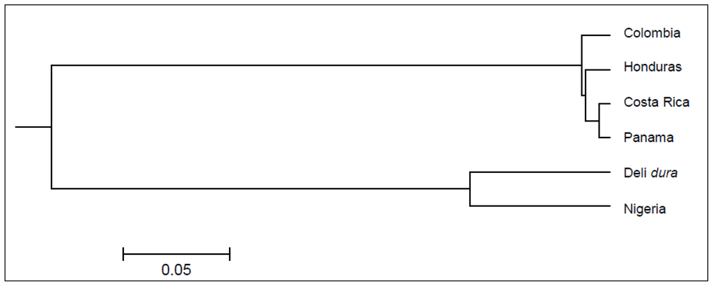 Regarding the genetic variation between the two Elaeis species, the heterozygosity in the E. oleifera germplasm varied from 0.102 to 0.200 (mean Ho = 0.164), while E. guineensis generated Ho from 0.118 (Deli dura) to 0.321 (Nigeria) (mean Ho = 0.220). E. oleifera generally had lower diversity, compared to E. guineensis, with higher Ho revealed by the Colombian and Panama palms (Ho = 0.200; Ho = 0.193 respectively). The higher Ho in both collections could be due to human assisted movement of palm samples that was probably accelerated during and subsequent to construction of the Panama Canal in 1914. Some palms could have been brought in from other South American countries, widening the genetic base of E. oleifera in these countries. Furthermore, the He value obtained for E. oleifera (mean = 0.262) was comparable to those obtained by RFLP (He = 0.225) and AFLP (He = 0.298) analyses in screening 241 E. oleifera accessions [15]. Among E. guineensis, He for the Nigerian samples (0.329) was lower than that obtained with E. guineensis EST-SSR markers [7,14], where the reported He values were 0.442 and 0.534 respectively.