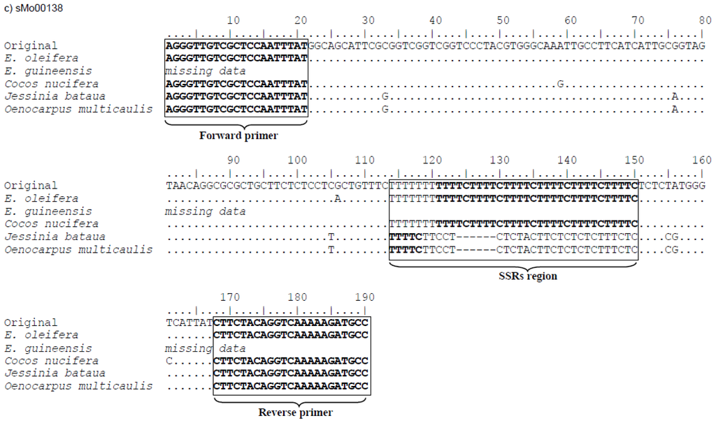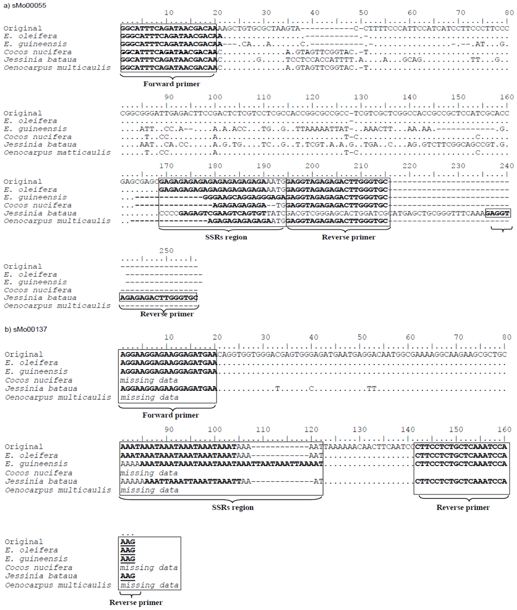 Three markers comprising various repeat types (sMo00055/di-repeat, sMo00137/tetra-repeat and sMo00138/penta-repeat) were used to determine the sequence variability in some of the species in Arecaceae family (E. oleifera, E. guinensis, Cocos nucifera, Jessinia bataua and Oenocarpus multicaulis). Amplified PCR fragments of these markers in selected individuals were cloned and sequenced. The amplicons of the three SSR markers were successfully cloned and sequenced. The sequences were aligned with the original sequence from which the primers were designed (Figure 2). In general, sMo00137 gave the highest sequence similarity among the samples analyzed, followed by sMo00138. sMo00055 showed the lowest similarity with highest number of bases interrupted in the flanking region.