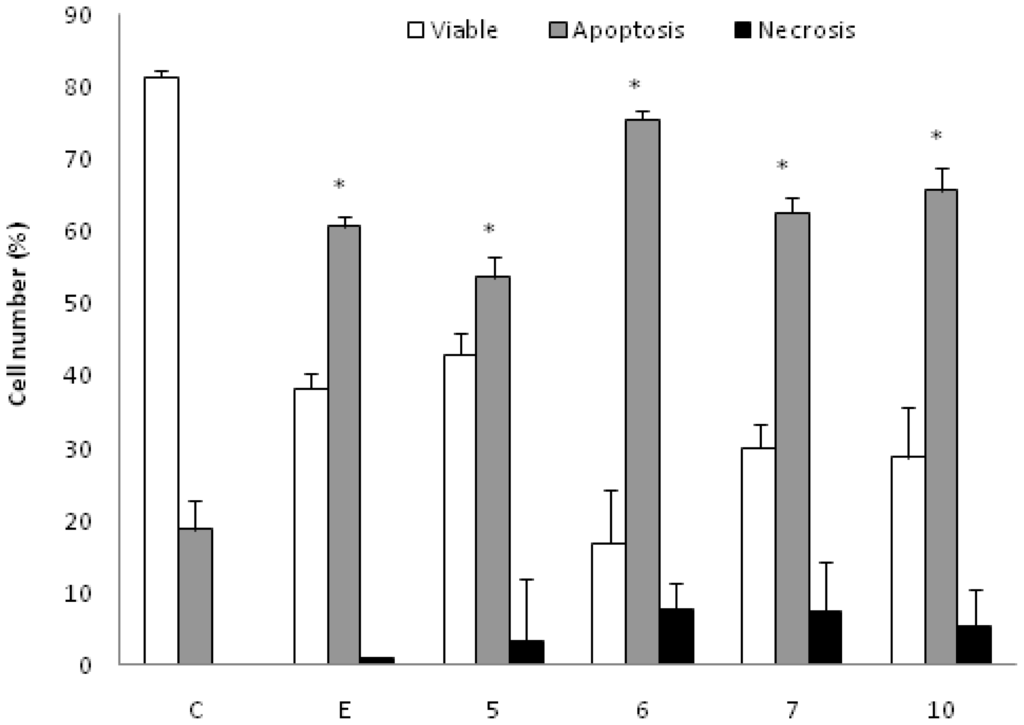 Effect of AcOEt:MeOH (95:5) (5), AcOEt (6), CHCl3 (7) and Catuabine B (10) in K562 cell population determined by fluorescence microscopy using Annexin V—FITC Kit, after 48 h incubation. The negative control (C) was the vehicle used for diluting the tested substances. Etoposide (E) was used as positive control. * p < 0.01 compared to control by ANOVA, followed by Newman-Keuls multiple comparison test. Data are presented as mean ± SD from three independent experiments.