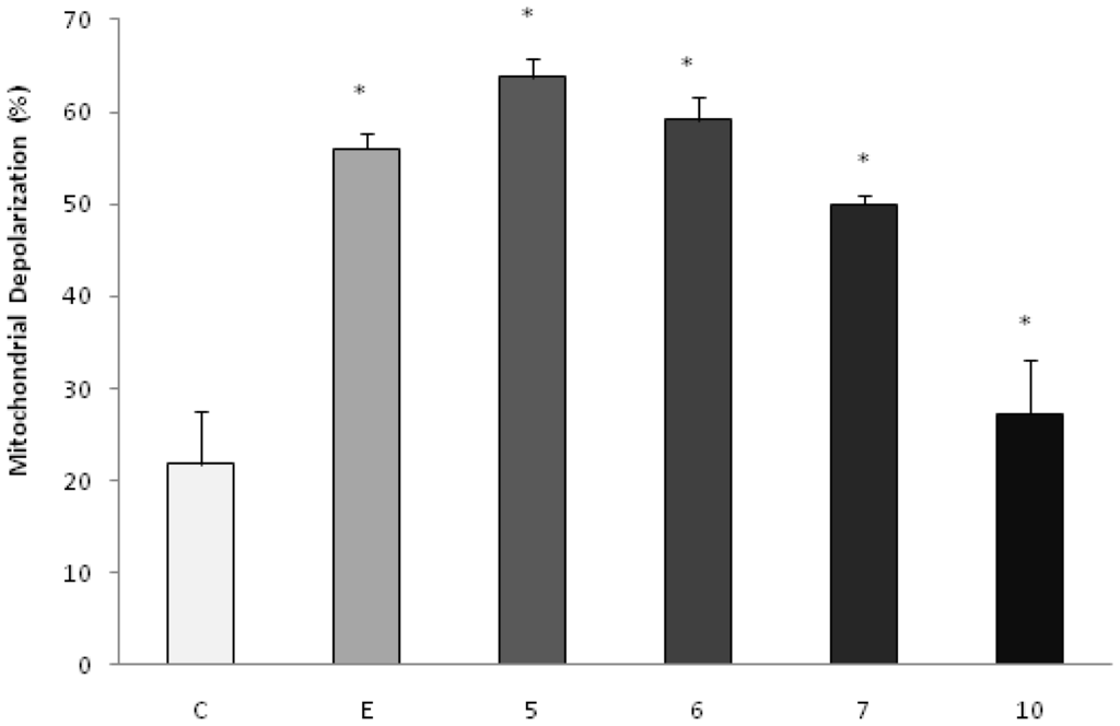 Effect of AcOEt:MeOH (95:5) (5), AcOEt (6), CHCl3 (7) and catuabine B (10) in K562 cell population determined by fluorescence microscopy using JC-1, after 48 h incubation. The negative control (C) was the vehicle used for diluting the tested substances. Etoposide (E) was used as positive control. * p < 0.01 compared to control by ANOVA, followed by Newman-Keuls multiple comparison test. Data are presented as mean ± SD from three independent experiments.