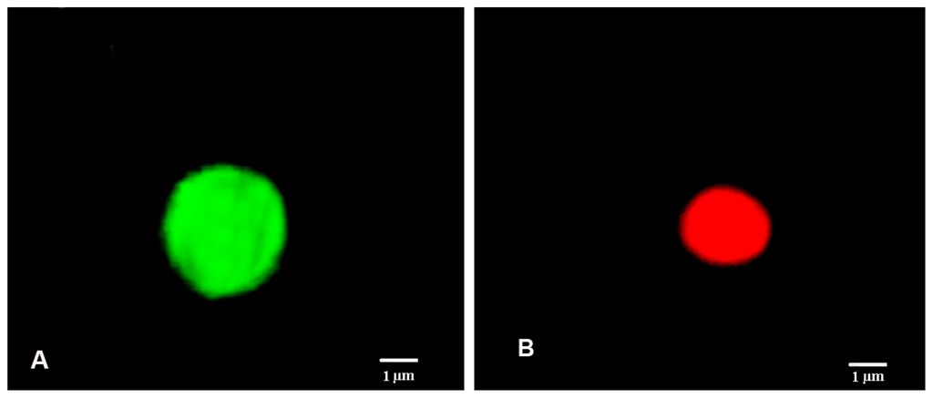 JC-1 staining of the cells. An image of K562 showing: (A) Green fluorescence emitted by cells is attributed to depolarized mitochondrial membrane; (B) No depolarized mitochondrial membrane emits red fluorescence.