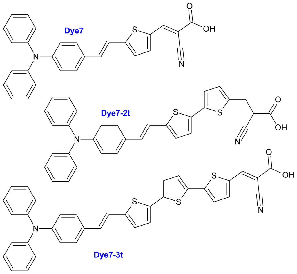 Sensitizer diagrams studied in this research (Dye7, Dye7-2t and Dye7-3t).
