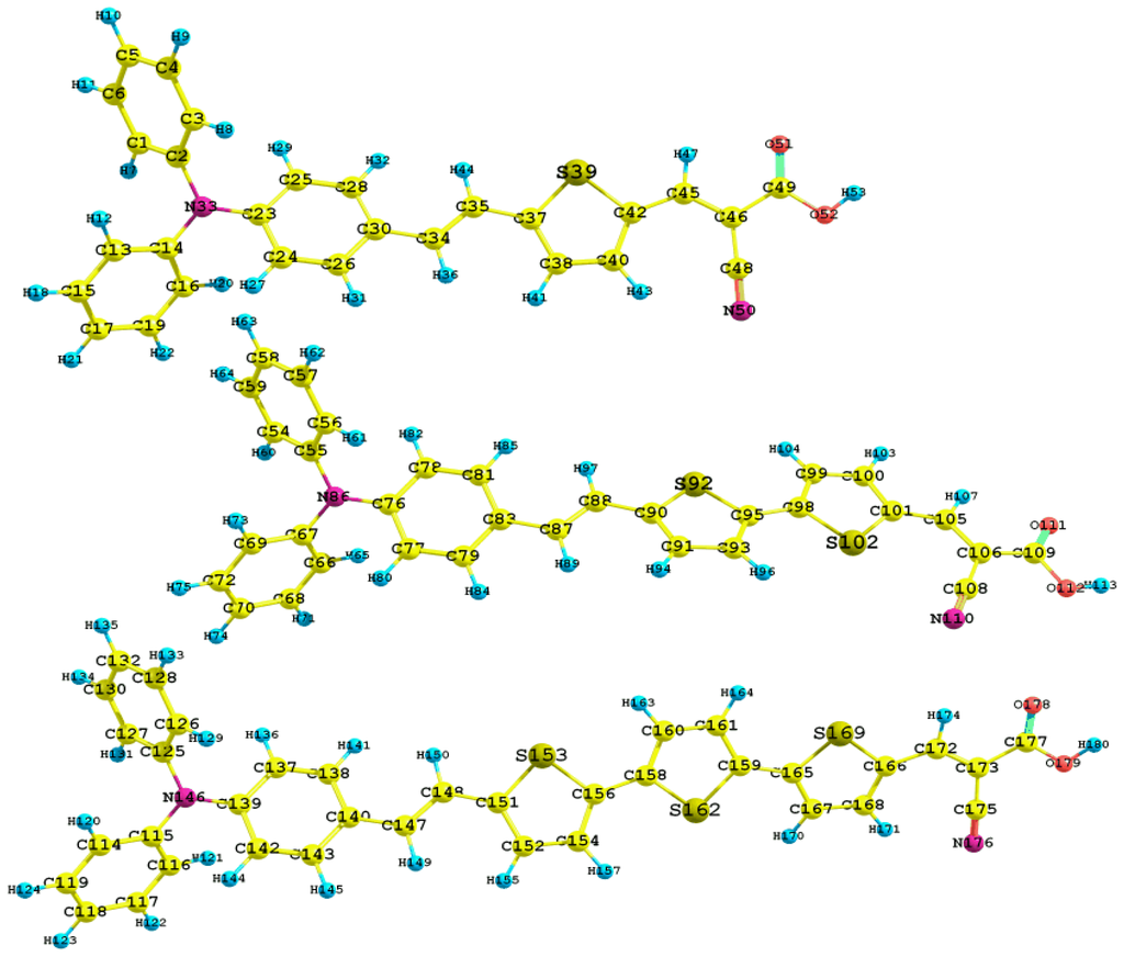 The aim of this work is to report the results of our research using molecular structure calculations and properties of the three dyes according to the density functional theory [42], developed by Walter Kohn in the 1960s. This method is implemented in the Gaussian 09W program package [43].
