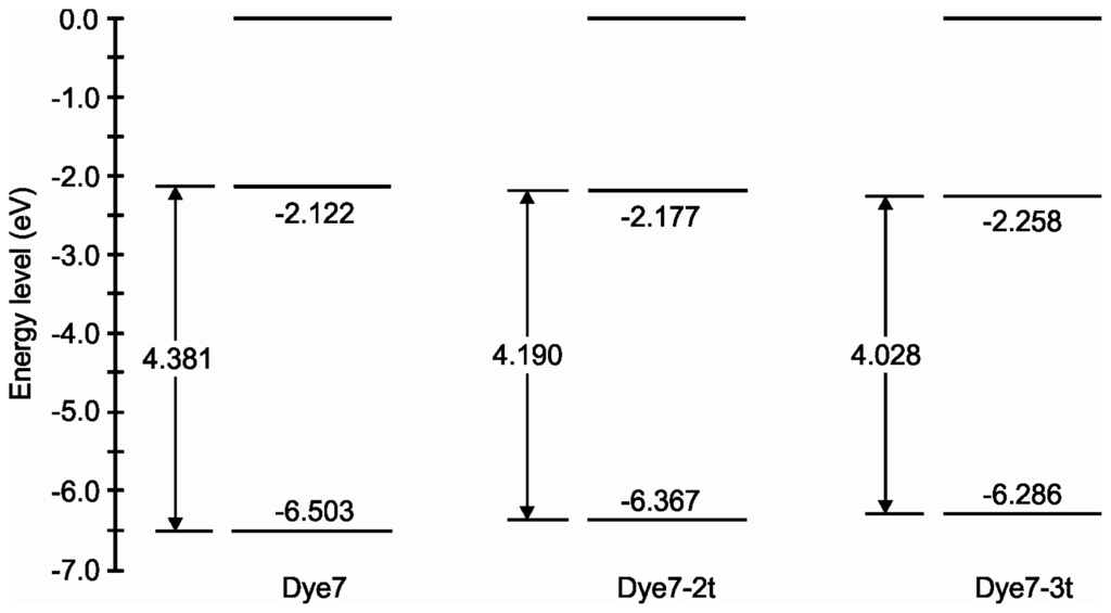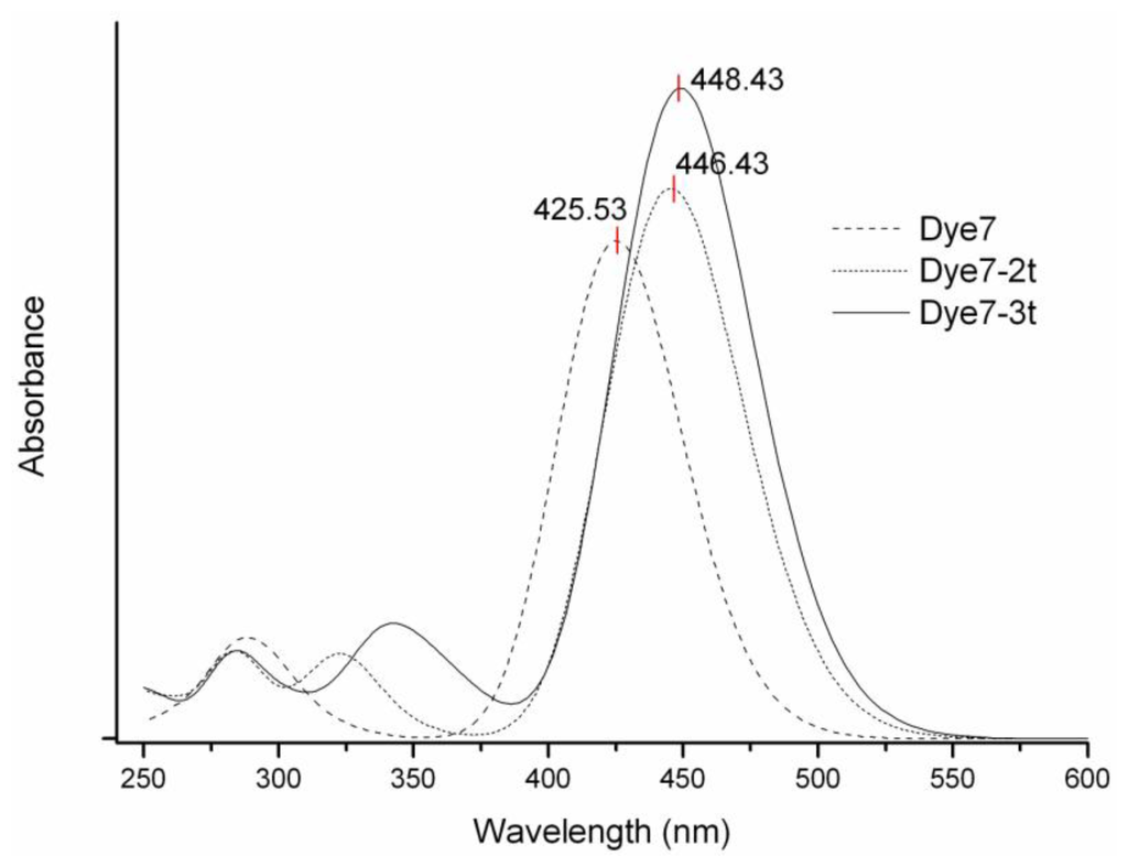 Absorption spectra for the proposed dye molecules are shown in Figure 3. The calculated value of λmax is an important parameter, which indicates that these molecular systems should be considered for use as a functional material (as dye in this case) in a DSSC, the value of this parameter for Dye7, Dye7-2t and Dye7-3t meets the requirements established in the literature [44].