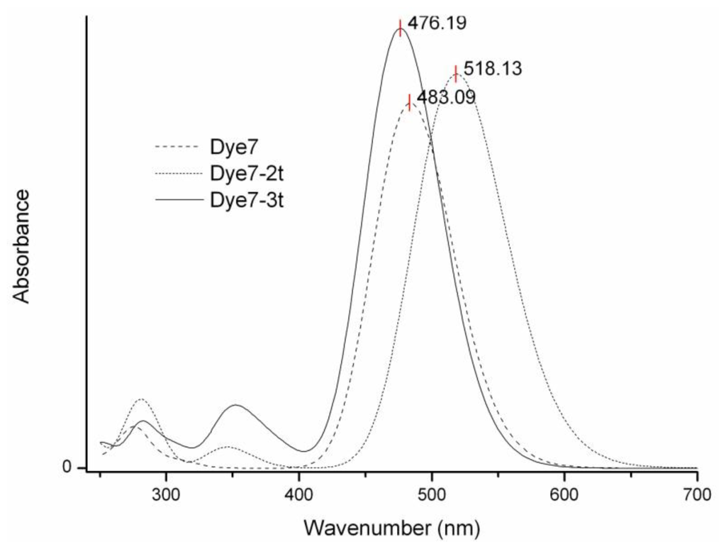 Ultraviolet-visible (UV-vis) spectra of Dye7, Dye7-2t and Dye7-3t.