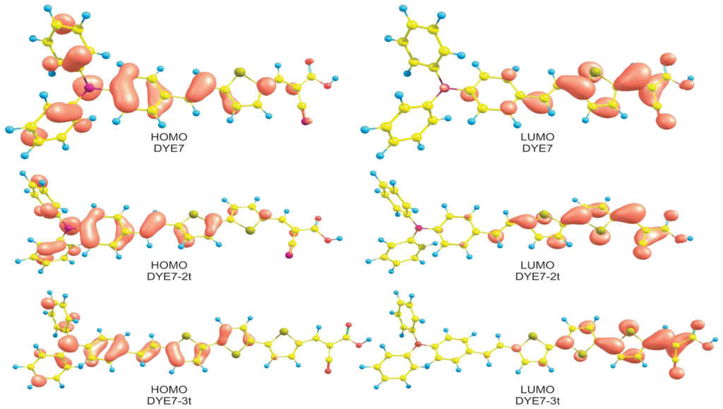 HOMO and LUMO orbitals of Dye 7, Dye7-2t and Dye7-3t calculated at the M05-2X/6–31G(d) level of theory.