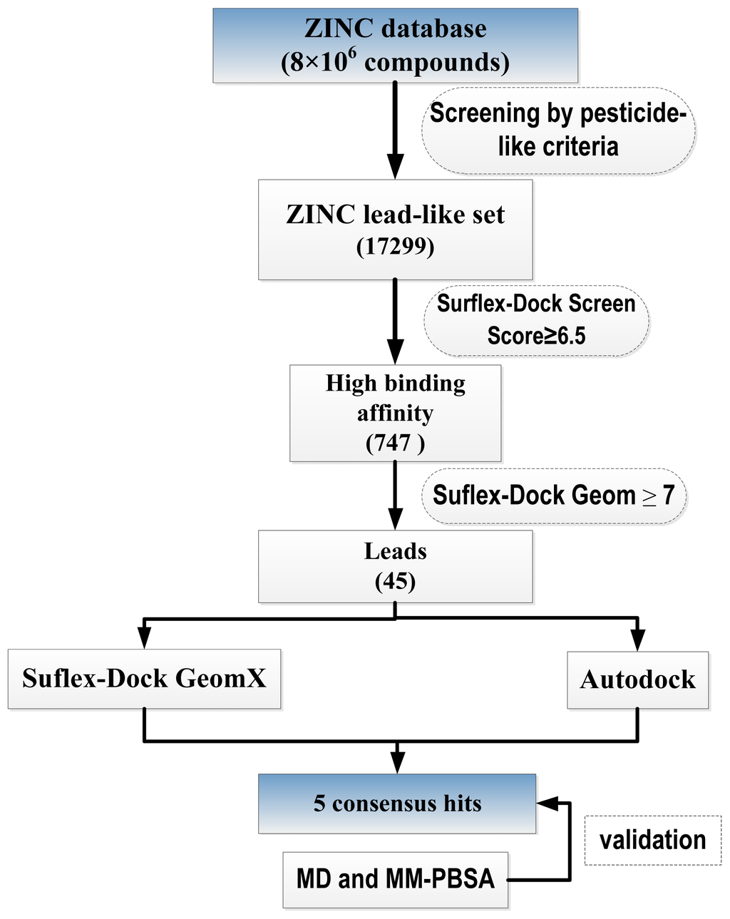 Flowchart of the multistep virtual screening strategy implemented in this work. After selecting lead-like compounds, the ZINC Database was subsequently filtered with Surflex-Dock screen and Surflex-Dock Geom. Top-ranked compounds were docked with Surflex-Dock GeomX and AUTODOCK. Consensus hits were identified and Molecular dynamics simulation, MM-PBSA calculations were carried out for validation.