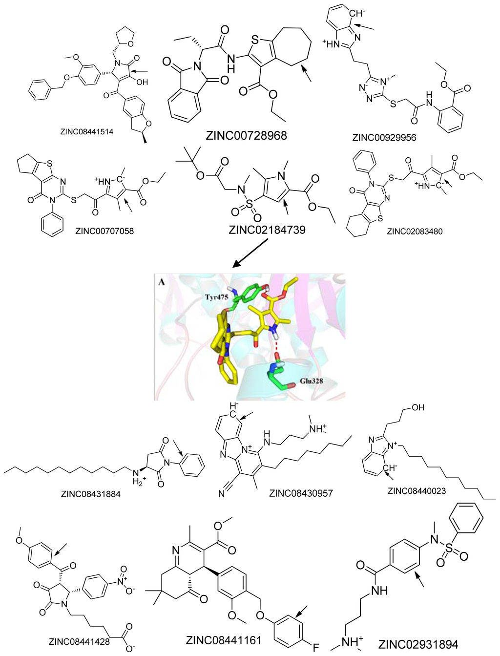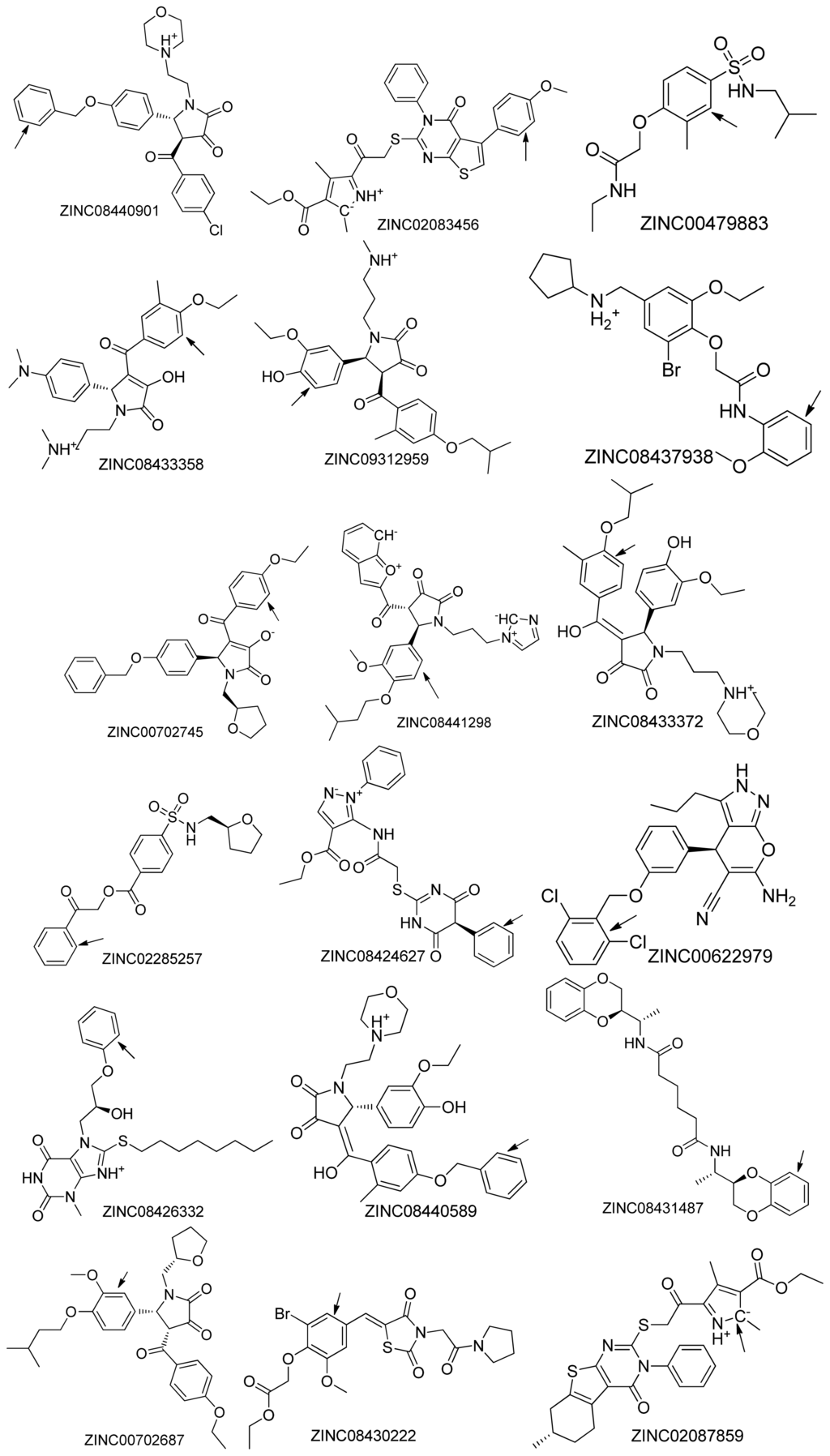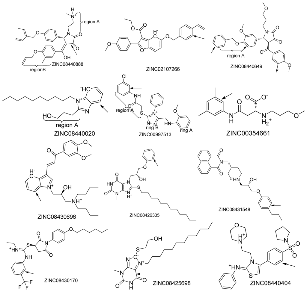 Chemical structures of the 45 top scoring compounds. Top scoring compounds with poor binding mode inside the active site of the protein (pdb id: 3NSN) are indicated with arrows.