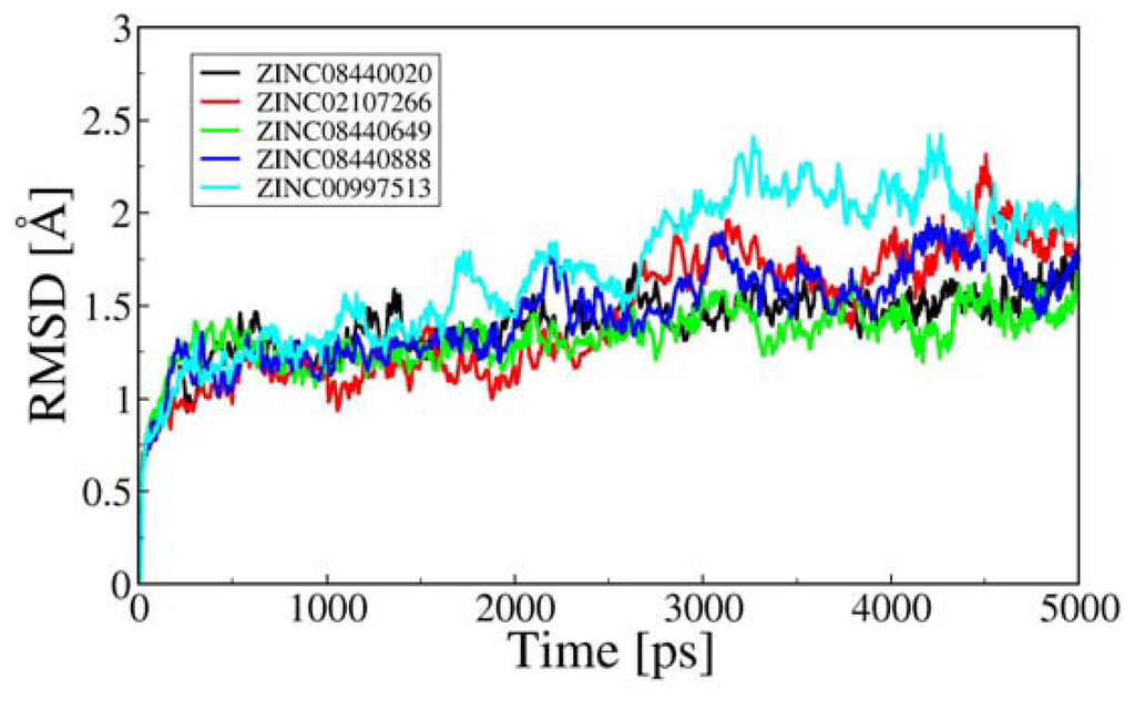 A 5 ns MD simulation followed by molecular docking was performed for the five complexes. The root-mean-square deviation (RMSD) values of the ligands in all simulations, compared to their starting points, were monitored and only those simulations in which the ligand exhibited a stable binding position were considered for further analysis. A stable binding position was defined by the ligand still being within 2.5 Å RMSD of all other stable ligand placements in its group at the end of the simulation. RMSD values of the protease Cα atoms relative to the initial structure were calculated and plotted in Figure 3. In the first 500 ps, the RMSD values increased quickly, which means that the structures of the five OfHex1-inhibitor complexes dissolved in the solution relax and remove the repulsion within the systems. As seen from Figure 3, ZINC08440649 and ZINC08440020 systems have reached the equilibrium after 2.5 ns of MD simulations with a RMSD value around at 1.54 Å while ZINC02107266, ZINC00997513 and ZINC08440888 systems have reached the equilibrium after 3 ns, and RMSD values of the ZINC02107266 and ZINC08440888 complexes were fluctuating around 1.78, 1.95 and 1.72 Å, respectively. The results suggested that the stabilities of the dynamic equilibriums for the five complexes are reliable and the trajectories can be applied to collect snapshots for further analyses. In addition, the stability of the system also proved the credibility of the docking results.